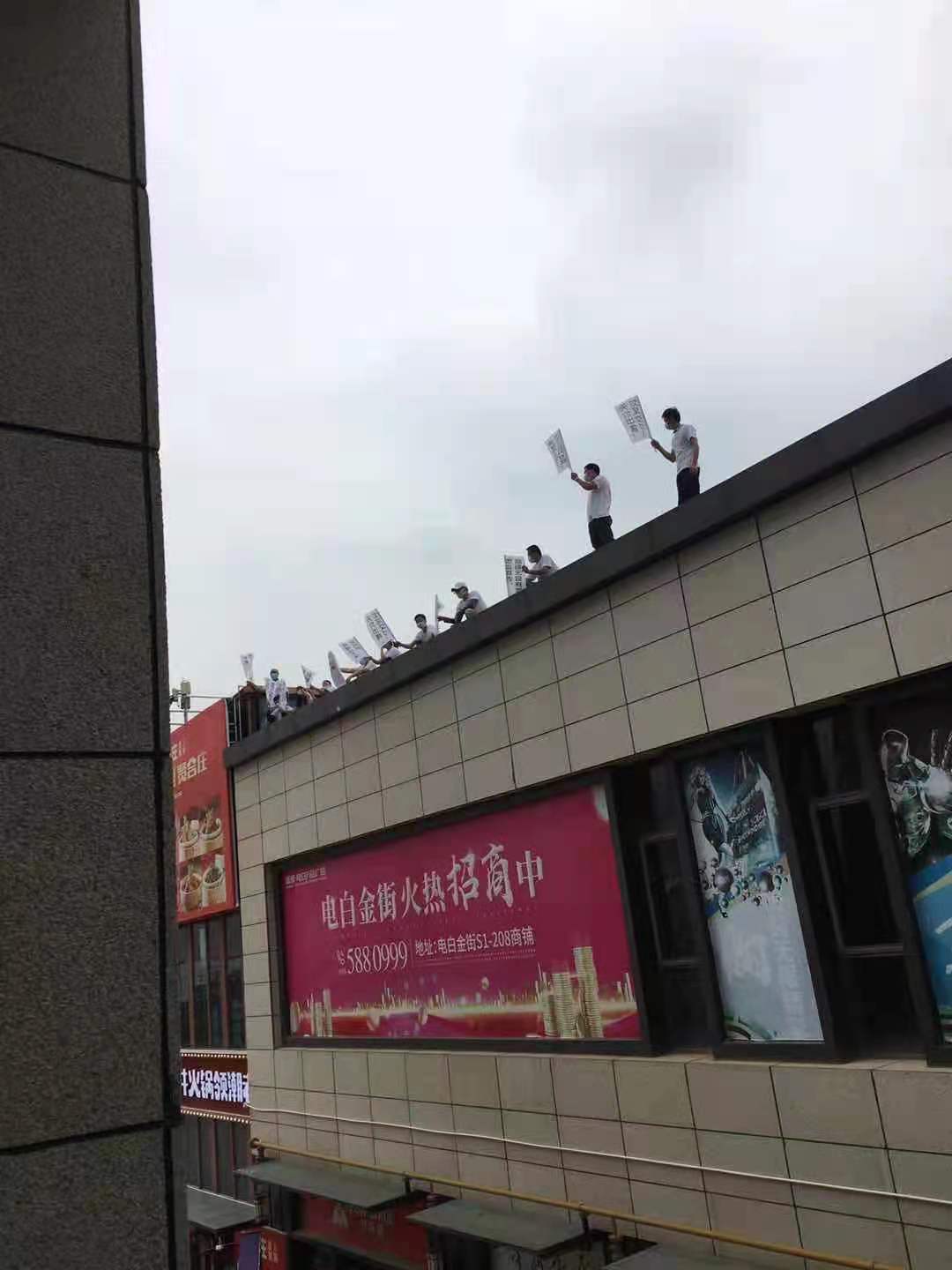 拥大件事,不见有人出来讲得?今日应该也很多人看到啊,当时也有不少人拍视频拍图片的,很快来了几部车的人穿着制度驱赶散了那些业主,不知10几分钟后,二楼的楼顶突然站了10几位身穿白色上衣后面印着:无良商家,退铺还款。这几个字眼的人,有男有女...估计也是金街的业主咯,唉也是可怜,诉求无门也不用跳楼的啊