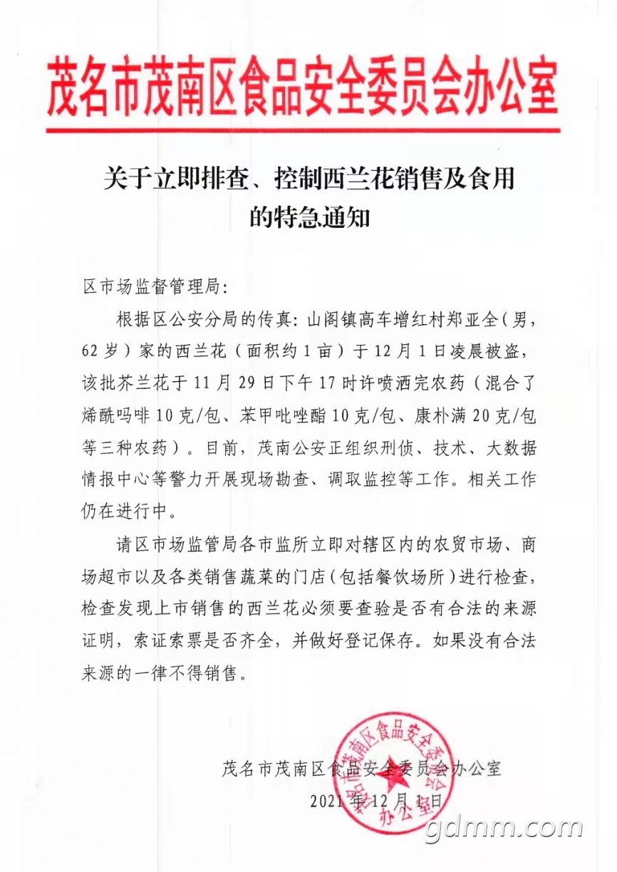 按茂名市局要求,请各餐饮单位、集体食堂马上暂停食用西兰花/芥兰花,有快检设备的待快检合格后再食用。芥兰花(面积约一亩)于11月29日下午17时喷洒完农药(混合了烯酰吗啡10克/包、苯甲吡唑酯10克/包、康朴满20克/包等三种农药,稀释喷洒),于今天凌晨被盗,大约400~500多斤。 通知中出现的西兰花/芥兰花图片,