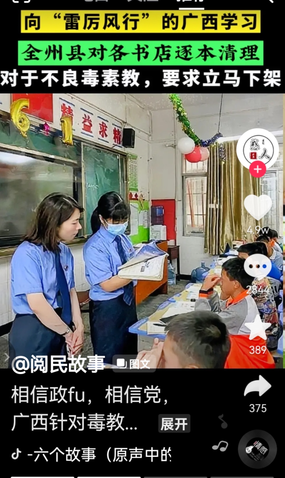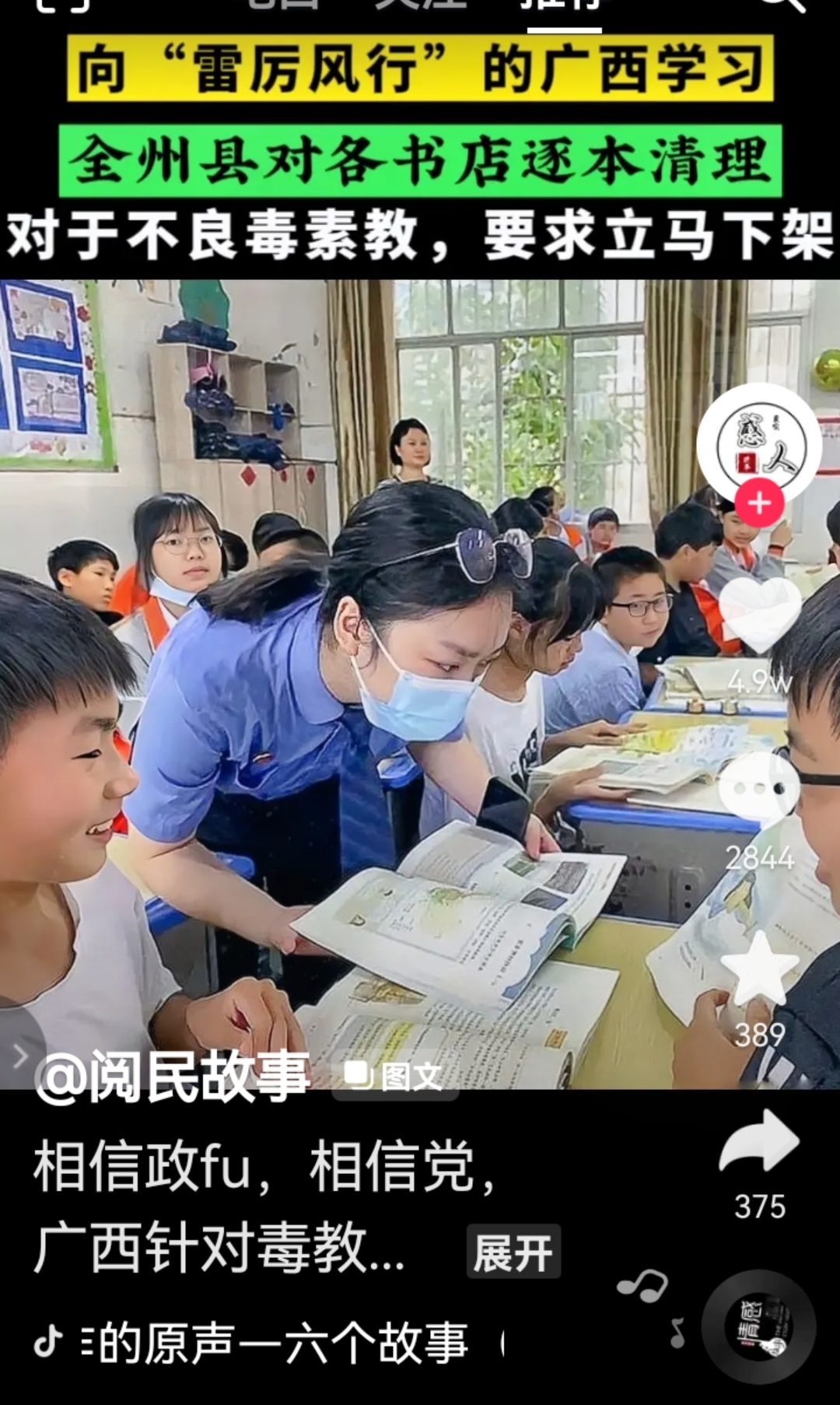 呼吁全市向“雷厉风行”的广西学习,对于不良毒素教材,要求立马下架