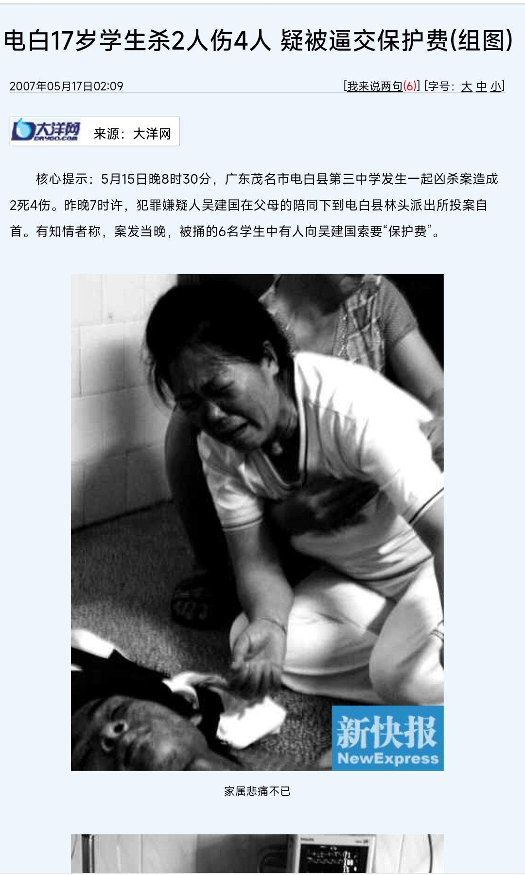 法外狂徒张三 说: http://news.sohu.com/20070517/n250061422.shtml 陈年老事了,报道上的东西,各个版本都有,看看就好。而事实的真相,令人发指,可以用死不足惜来形容。上面这个报道相对较真实一点。 点击展开... 为何现在更加信息化的时代,树仔发生的事情反而不能被报道?