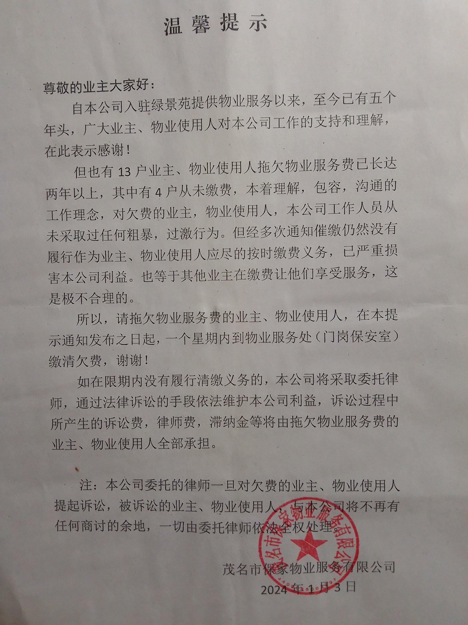 绿景苑什么时候入驻茂名市保家物业服务有限公司?是谁请进入驻?绿景苑业主委员会还没有正式成立,哪来业主委员会?是不是不招开业主大会通过就自已成立业委员会,然后委托茂名市保家物业服务有限公司进行向业主收缴物业管理费?业主委员会、公司挂牌地址在哪里? 从温馨提示告诉我们,这次开发商集团毫不留情了,高级律师上阵,你们就乖乖听话吧。那么,记得有次公开物业收入情况,月收入八、九万,还有停车位和商铺没有公开收入呢?每月除了看门几位等人工资外,还有剩下多少钱?听说剩下没有了,基本与收支平衡。19年来有谁知道帐目收支情况?没有呀,都是模模糊糊,收入多少,就用完多少。请问:这么多项收入,物业管理费用在何处呢?