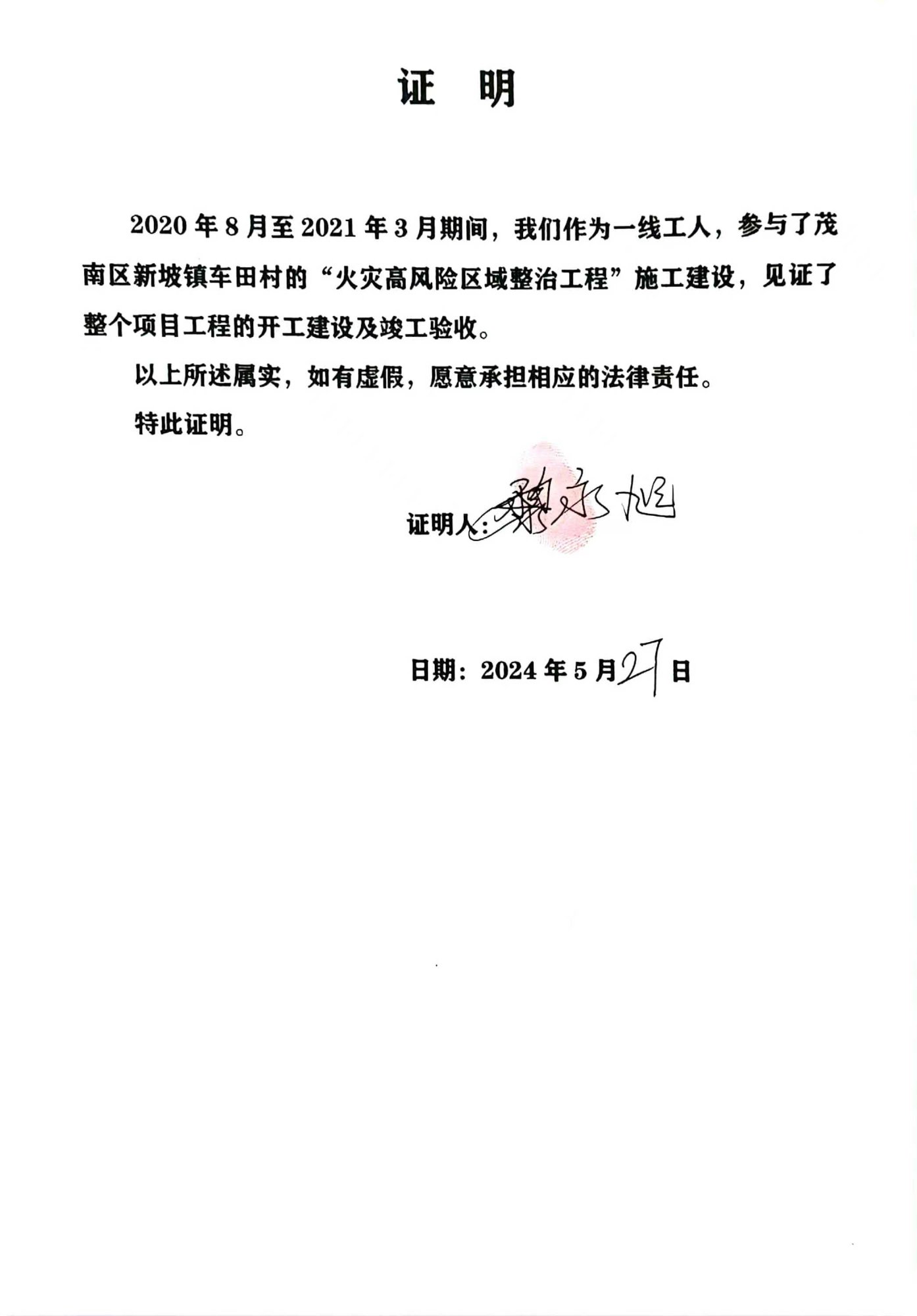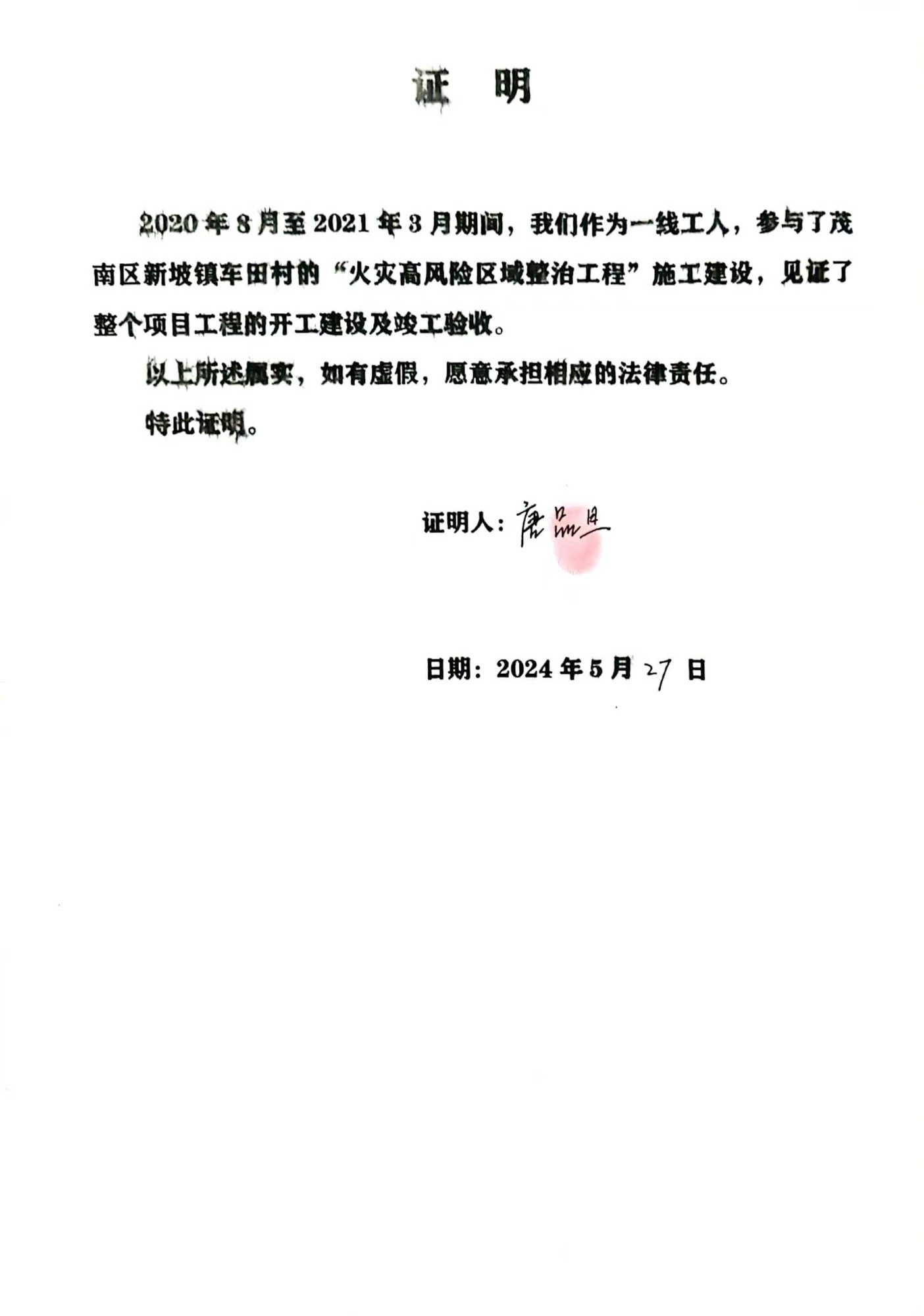 三、时任镇委书记曾x清、镇长杨x、副镇长何x敏承认此事。车田村委会也出具书面证明,证实此项工程是由我公司施工建设和我方有施工图片、员工的证明。(同年茂名市化州市xx镇高风险整治工程未获得通过,我公司分文不取)........我一直上告新坡镇政府