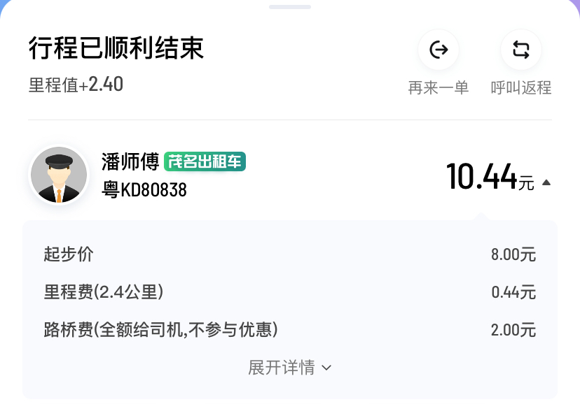 从电白万达广场到海堤红树林,收费10.44元。系统自动扣费的,当时没注意,之后才发现竟然收了2元: 路桥费。我长这么大,在水东的街道内还没有见过什么路桥费。。。 2块钱不是什么大钱,我可以打赏,但是你不能来硬抢啊。真恶心~