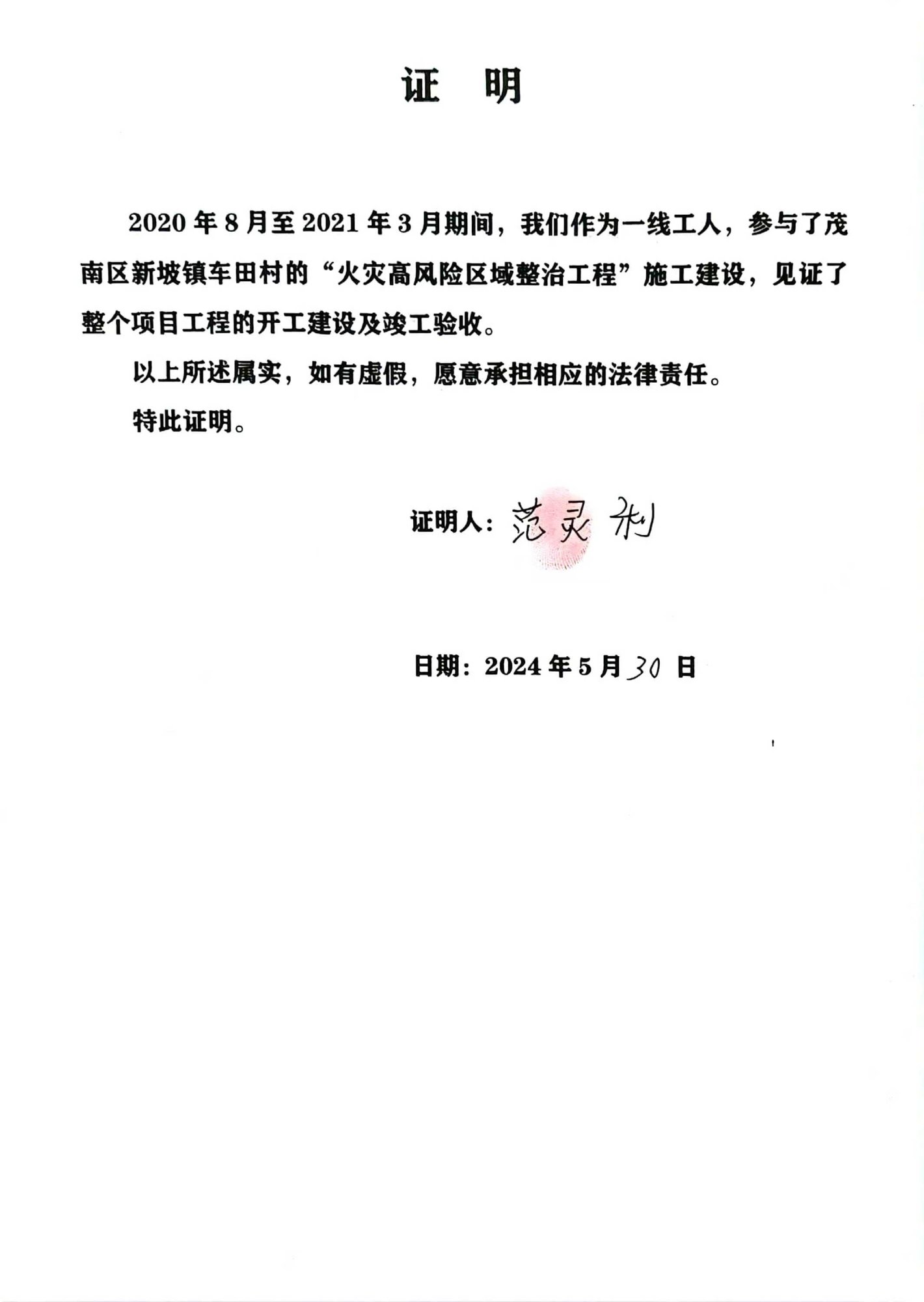 对于此次火灾高风险区域整治工程,车田村委会出具的书面证明,证实了该工程由茂名市众扬设计制作有限公司陈先生等人施工建设。工程竣工不久后,杨敏镇委书记完全否认此事,他说按合同办事,言下之意当时双方没签合同,且事后也不补签,巳至于郑勇患病因无钱医治而去逝。30万元的工程款就等于打水漂了,十位工人耗时8个月的汗水就是白流了,岂不是挖一个巨大的火坑让群众往里面跳吗?