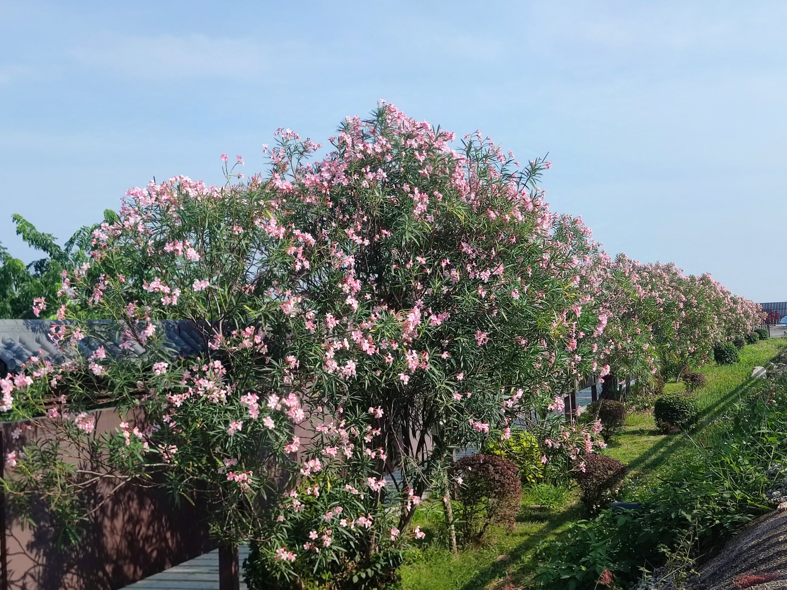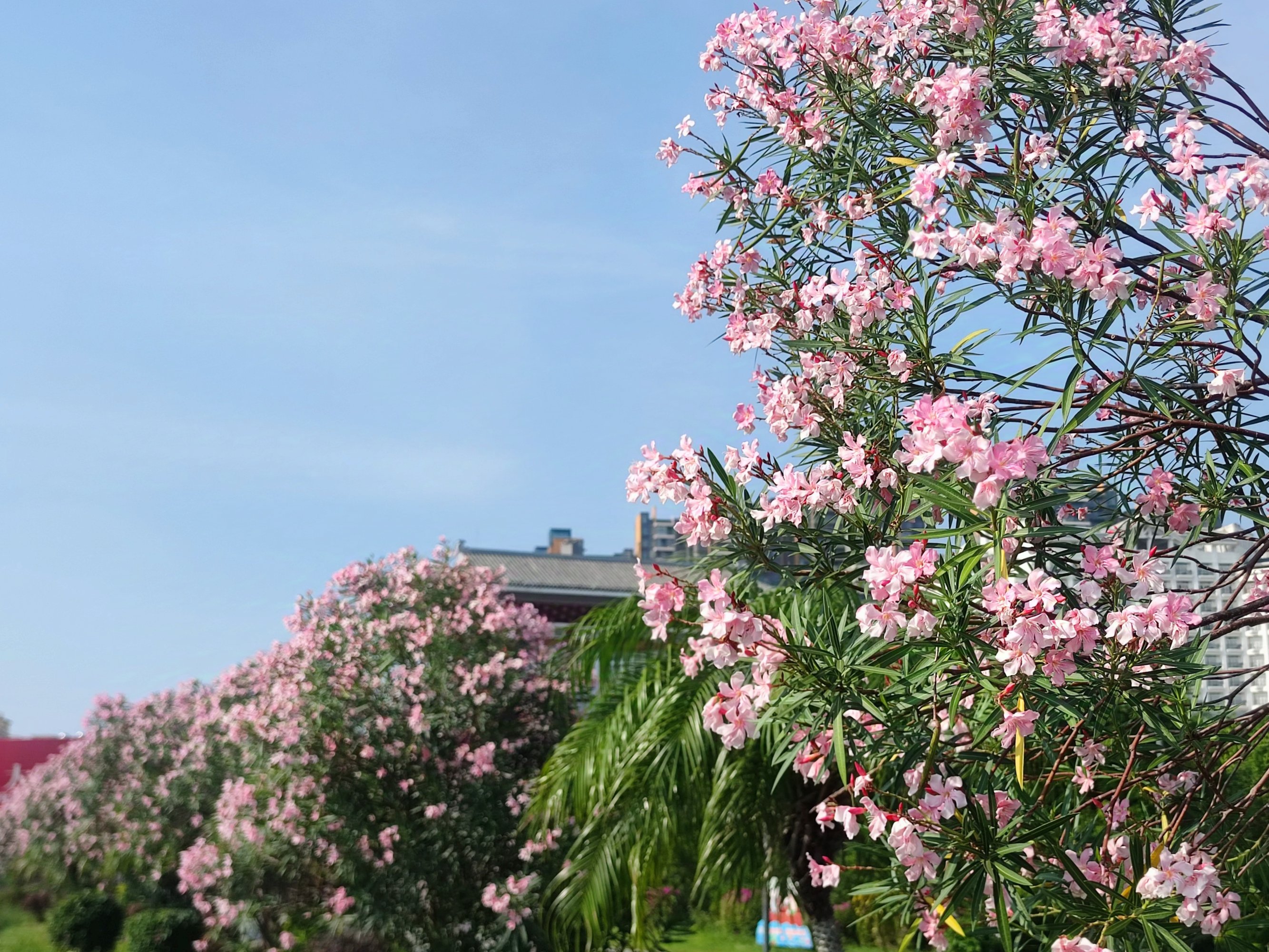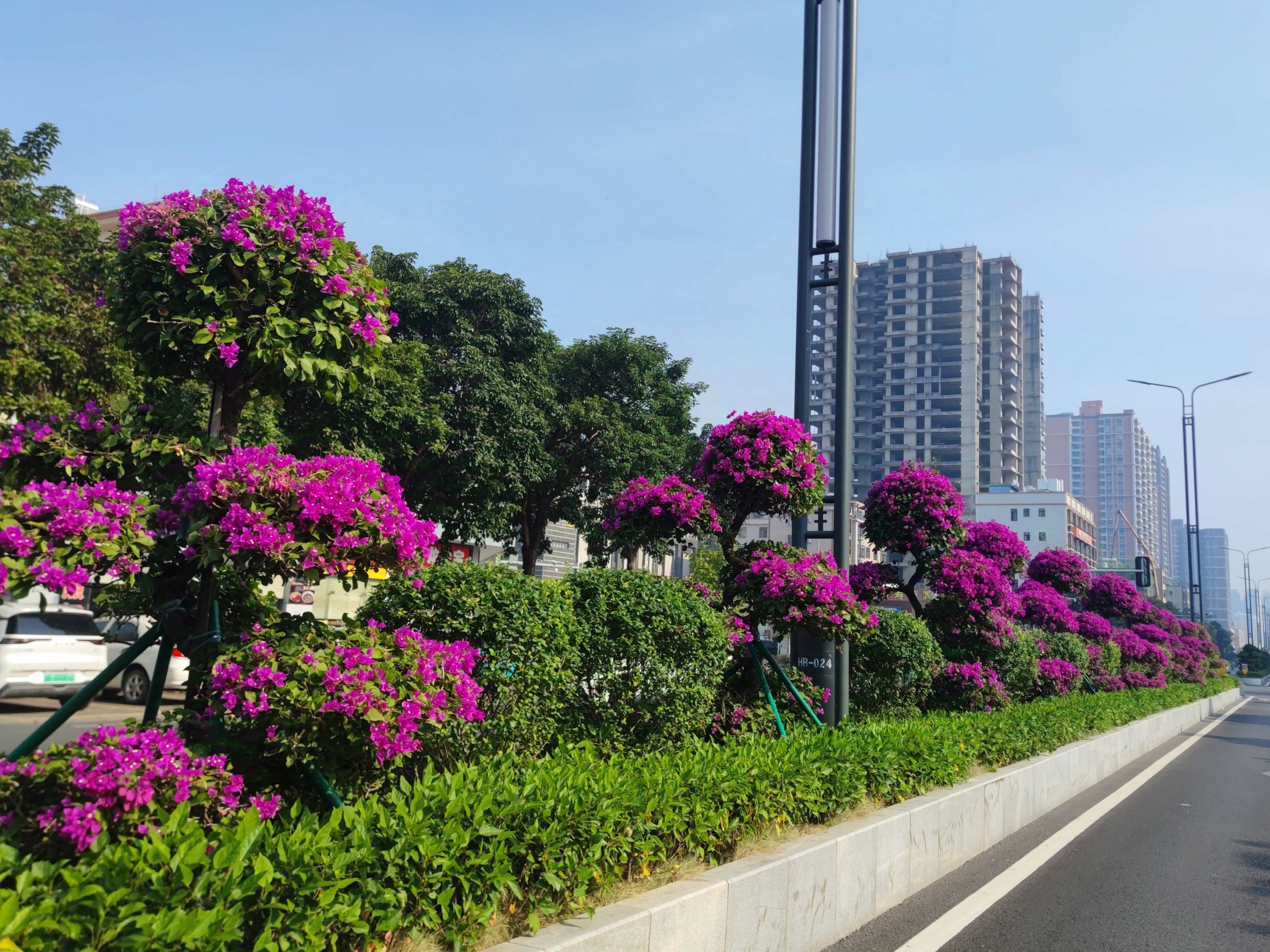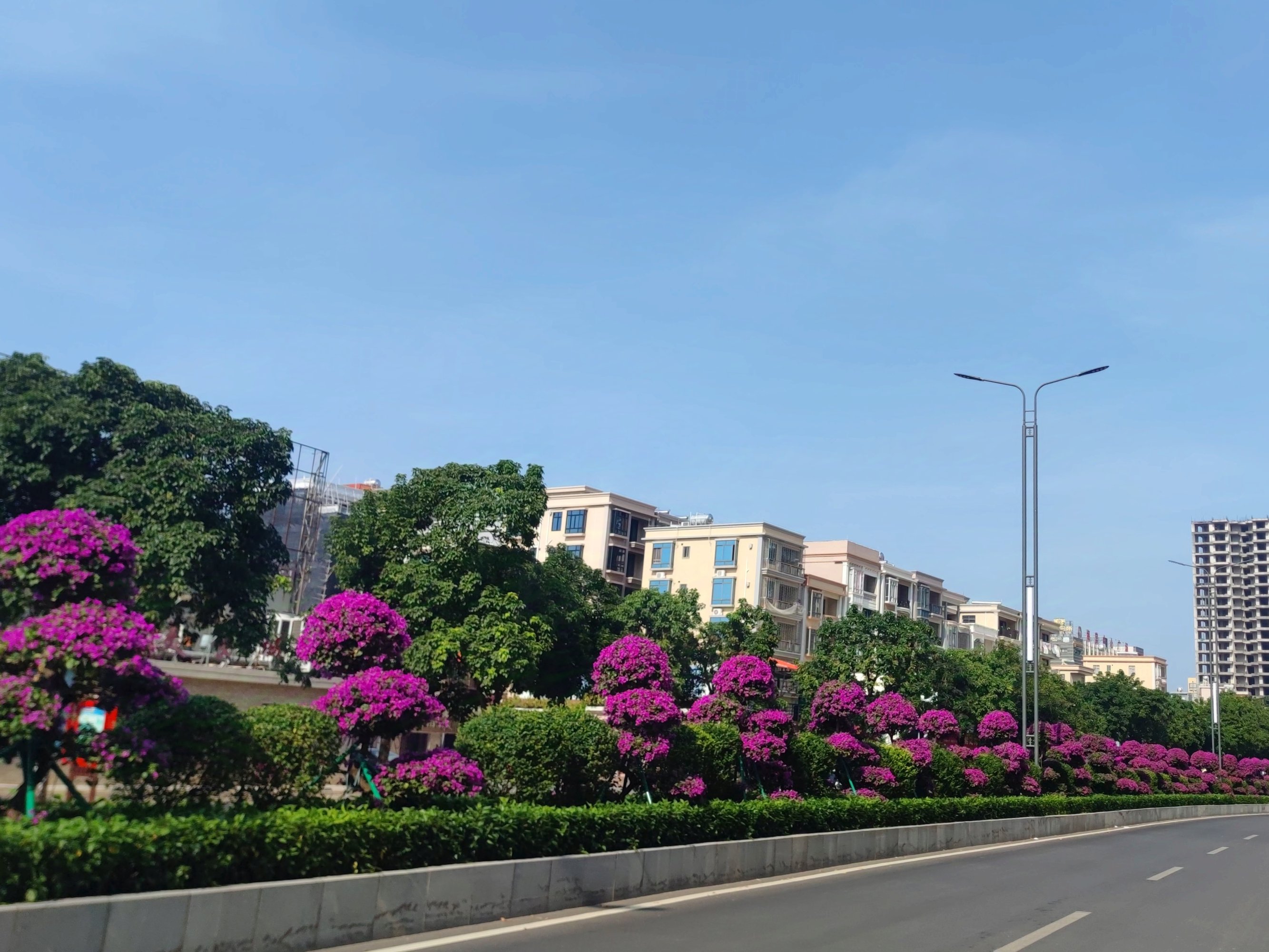 海堤的是夹竹桃花,有毒。路边是三角梅。