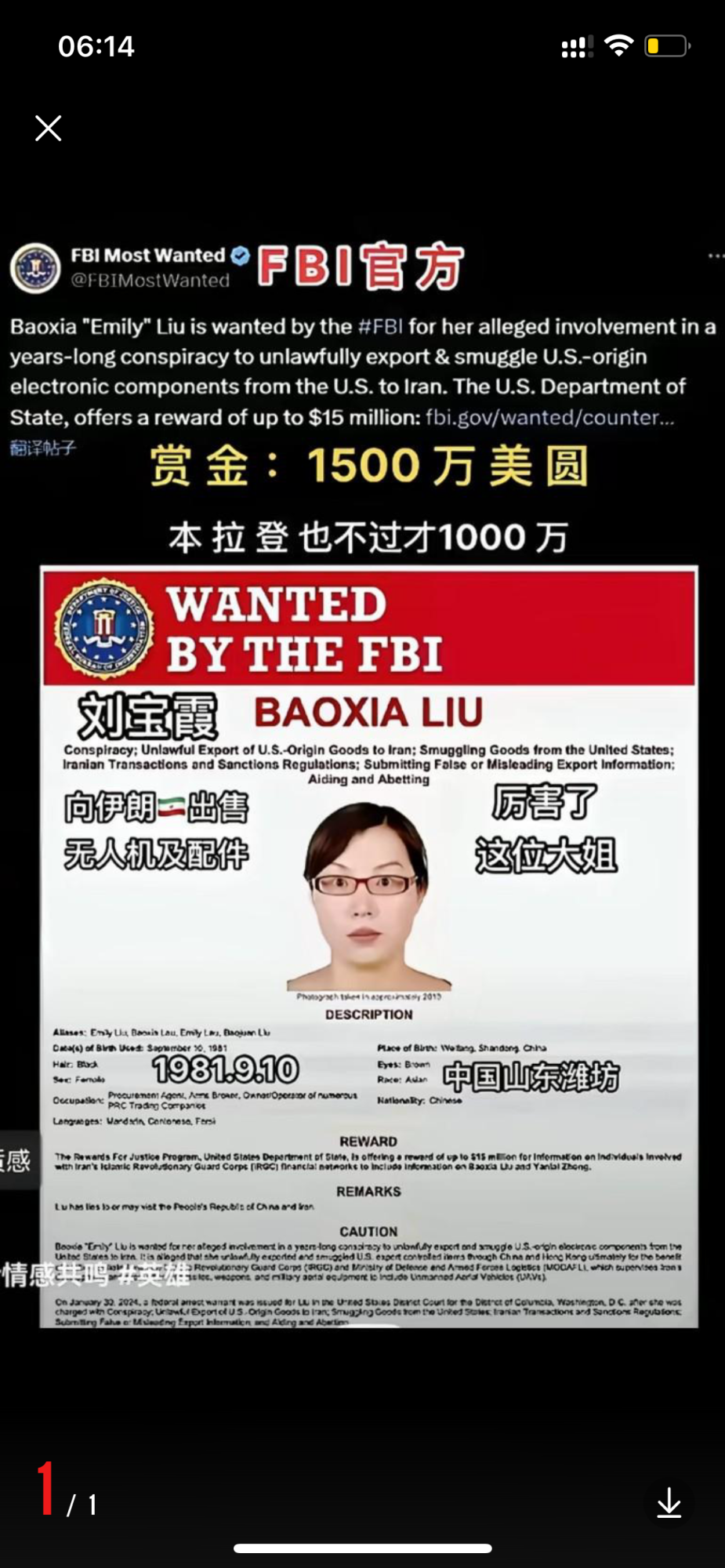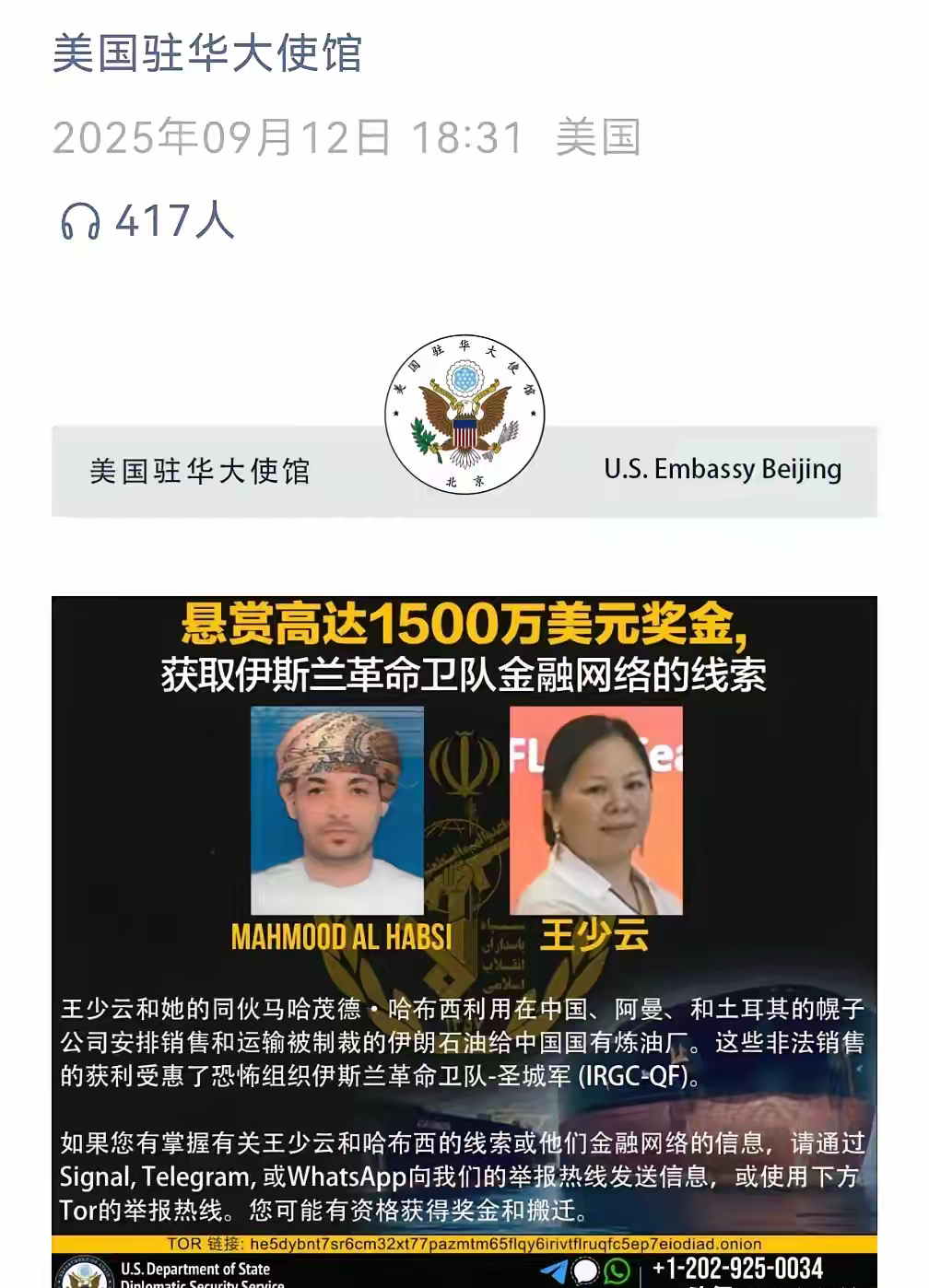 cz752 大学三年级 注册 2019-12-20 消息 802 反馈评分 94 点数 11 2025-09-13 iOS Mobile Safari 18.6 #95 美国悬赏 1500 万美元缉拿王少云… 附件 IMG_7548.jpeg 773.2 KB · 查看: 275