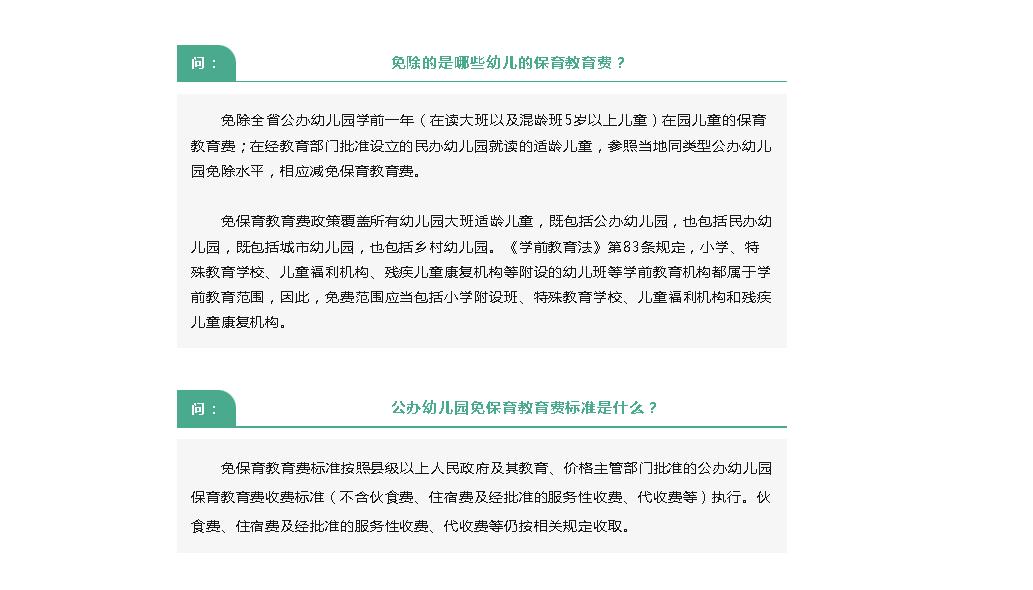 免除全省公办幼儿园学前一年(在读大班以及混龄班5岁以上儿童)在园儿童的保育教育费;在经教育部门批准设立的民办幼儿园就读的适龄儿童,参照当地同类型公办幼儿园免除水平,相应减免保育教育费。