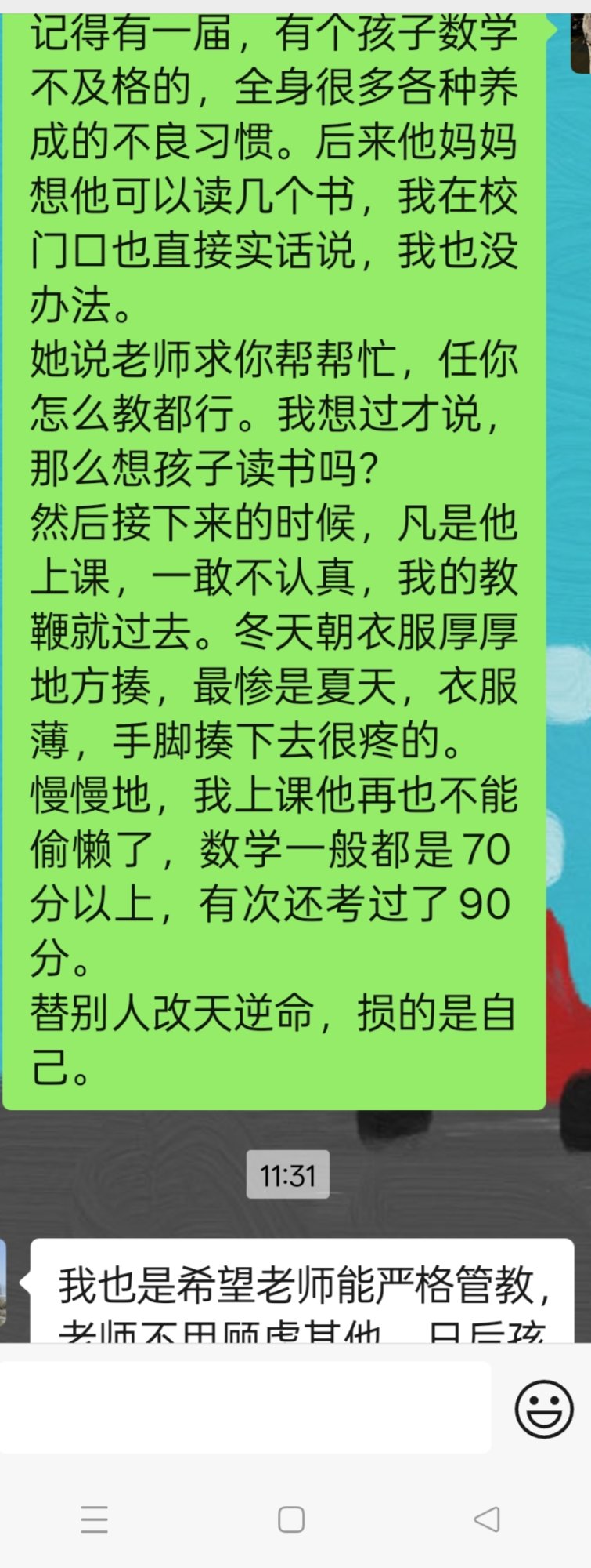 小石龟 说: 我信契约精神!这些真正关心孩子的家长,我会揍,严格要求。就算万一碰上老坛酸菜那种家长,讹我一块钱,我都把老坛酸菜的头扭下来,不管他信不信! 点击展开... 这是关于老师教育过程中的惩戒权问题。相信大部分家长都赞成,与老坛酸菜的投诉问题无关。
