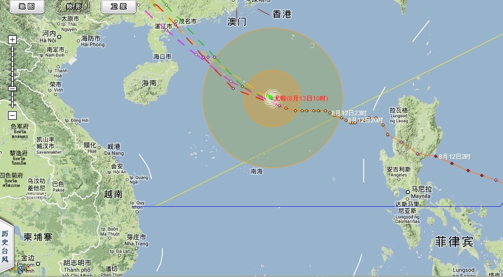 今年第11号台风“尤特”的中心13日07时位于广东茂名东偏南方约640公里的南海北部海面上,北纬18.1度,东经115.7度,中心附近最大风力有13级(40米/秒),中心最低气压为960百帕,七级风圈半径320公里,十级风圈半径130公里。 预计“尤特”将以每小时25公里左右的速度继续向西偏北方向移动,逐渐向广东西部到海南东部一带沿海靠近,强度还将有所增强,并将于14日下午到晚上在广东阳江到海南琼海一带沿海登陆。 徐闻至阳江之间登陆,电白正在中心,