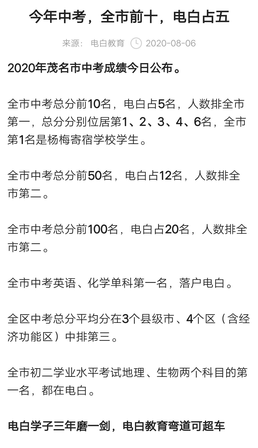 這實打實非文字遊戲的成績是電白教育多年灰霾下的一抹曙光,希望這是個好的開始。個人覺得,因歷史原因,混進電白教育界,不學無術沒點責任心的老師不在少數,導致教育隊伍士氣低落,學生無心學業,期待能有個有魄力的領導大刀闊斧地清除這些害群之馬。 詛咒那些為害未來為害教育的毒瘤。 至少还要十年,等那帮人退休,这才能改变电白老师的水平