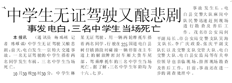 中学生驾驶摩托车出大祸