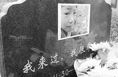 她墓地有她一张笑吟吟的照片,碑文正面上方写着:“我来过,我很乖(1996.11.30.--2005.8.22)”