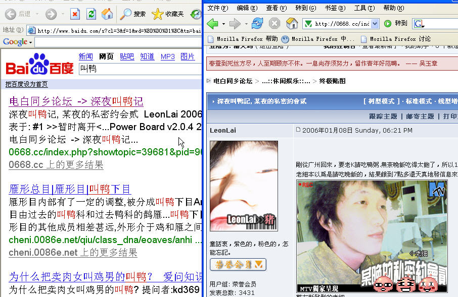 潘火鸡 小学三年级 注册 2005-07-08 消息 247 反馈评分 13 点数 1 2006-03-14 #1 在百度搜索“叫鸭”,第一页第一条结果竟然是。。。。 [attachmentid=71303] [attachmentid=71305] 附件 111111.jpg 78.9 KB · 查看: 296 222222.jpg 182.6 KB · 查看: 308