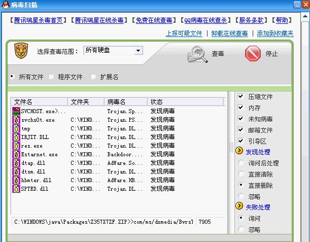 随后我使用了木马杀客软件,进行硬盘扫描,这么作的好处是知道木马病毒所在的位置,同时木马杀客软件将这些木马病毒进行删除操作,如果不能删除就将那些病毒进行隔离。扫描结果是: