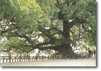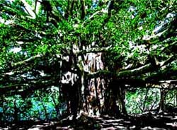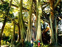 华夏榕树王 盈江人把榕树称为大青树,傣族人民还把雄姿英发的古榕奉为神树。千姿百态的榕树遍布盈江,把盈江的山水点缀的更加秀美。其中,生长在盈江县铜壁关老刀弄寨、盈密公路旁的一棵榕树,因其树龄长、气根多、树冠高大,需数10人合围,在众多树木中犹如鹤立鸡群。 这棵树树龄约400多年,高约40米,气势雄伟,树冠象一把巨伞,浓荫四布,遮天蔽日,冠荫覆盖面积达10余亩,落地气生根130多根,游客在树下穿行,犹如在原始森林遨游,其趣无穷,令人惊叹,被誉为“华夏榕树王”。这棵稀世名木被认为是我国已发现的最大的榕树,也是我国目前最大的一株树。