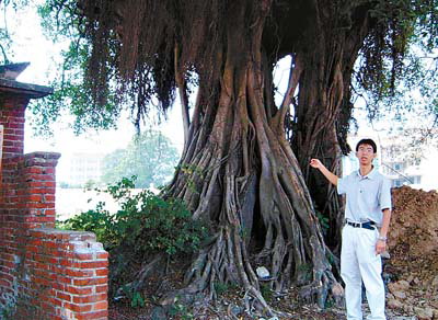 投资百万,为古榕树让道 记者从石碣镇第二小学获悉,该校在联合办学过程中,为保护一棵有800多年树龄的古榕树,于扩建工程中对规划图三易其稿,投入资金100多万元,将规划中位于古树处的三栋教学楼改建在原运动场,学校运动场则整体搬迁新址。二小校长朱志权表示,今后学校将围绕古树建成一个绿化带,将其打造成学校的一个“绿色环保”教育点。 古榕树需10名学生合抱 在该校副校长李勇带领下,记者来到了校外一块已经平整过的土地,发现该树地面上根盘结交错,主干中空部分足可容纳一名小学生,分枝周围长满了须状根系,整个树冠犹如一个硕大的绿色蘑菇云。距该榕树几米远的地方,还有一座红砖砌成的土地庙,因年代久远已略显沧桑,周围尚散落着密密麻麻的半截粉红色香支。 李副校长介绍说,该榕树直径3米左右,高约30米,树冠遮阴面积有上千平方米,要十来名小学生才能将其完全合抱。曾一度被当地的村民视作风水宝树,每月初一和十五都会有村民前来拜祭,由于村民的自觉保护,古树虽历经数百年仍长势良好。“树干中空的部分有一些烧焦的痕迹”,他认为这可能是古榕树曾遭过雷击,或是村民上香时所致。 三易规划图保护古树 石碣镇第二小学朱志权校长在接受记者采访时说,该镇近年在创办教育强镇的过程中,积极推进联合办学,坐落在桔洲村的石碣二小作为镇内的第一所联办小学,计划按省一级学校标准扩建,总投资达5000多万元,其中已建工程为1700多万元,扩建工程达近4000万元。目前梁家村小学、单屋小学、涌口小学、桔洲小学和黄泗围村的学生已经并入该校,届时还将吸收唐洪小学、水南小学和西南小学的学生到该校就读。 在扩建过程中,按照2004年初的第一次规划,兴建中的教学楼正好位于古榕树处,如果照此进行,要么将其砍掉,要么将其整体移植,前者难免会让人扼腕叹息,后者不仅不利于保存原貌,而且成活的可能性也比较低,这引起学校师生和镇负责人的高度重视。为此,镇重点办和学校相继对原规划图进行了两次“大手术”,最后在今年才形成最终方案,决定投入100多万元资金为保护古榕树让道,将规划中位于古树处的三栋教学楼改建在原运动场,学校运动场则整体搬迁新址。 “古榕树是不会说话的活化石,对其妥善保护是理所当然的”,朱志权校长称,在保护古榕树的过程中,该镇镇委书记邓浩全和镇长刘始团也曾多次过问,并在本月18日到学校调研联合办学扩建工程施工进度时,强调将在适当时机邀请有关方面的专家鉴定其具体树龄,考证其相关历史,为师生和居民保护好这片富有历史底蕴的“绿色”。 围绕古树打造绿色环保教育点 学校今后如何保护古榕树呢?朱志权校长说,因该古榕树正好位于学校扩建后的中心区,学校拟投入资金几十万元,以古榕树为中心种植花草,合理安排配套设施,建成一个绿化带和休闲带。 他认为,古榕树是学校不可多得的财富,是学校绿色的标志,学校将借机把其打造成一个“绿色环保”教育点,使其成为学校绿化环保教育的一个典范,从小培育学生的绿化意识,了解石碣和桔洲的历史,“让活标本、活化石在潜移默化中教育和感染学生”。另外,因村民对古榕树有着割舍不去的感情,学校将在课余时间对村民开放,让村民共享古榕树的一片绿色。