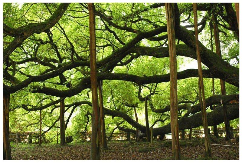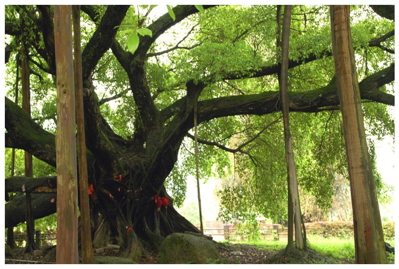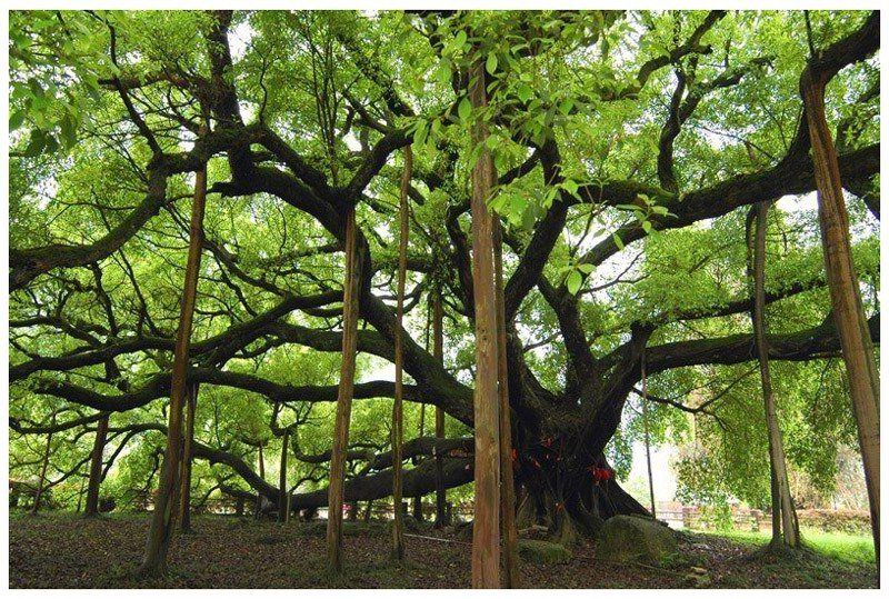 福建多榕树,福建省省会福州,就有许多阅尽沧桑的老榕树,其中树龄达300年以上的一级古榕树就有23株,福州也因而号称榕城。榕树的生命力极为旺盛,鸟雀食了榕树粉红色的种籽,把粪便拉在悬崖峭壁、石头缝里、古宅的院墙上,龙眼树的树干上,榕树都会顽强地生长起来,即使身处逆境,却不屈不挠,英姿勃勃。把锯下的一段榕树插于土中,即可落地生根,历经严寒酷暑的威逼,长成拔地参天的大树。在集美区侨英街道东安社区居委会东山自然村,一株258年的古榕繁衍出一片绿阴世界,繁枝密叶,蔽日遮天,树冠舒展,亭亭如盖,占地约4000平方米。成为一道令观者啧啧称叹的风景。