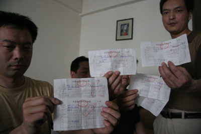 过了六七天,他们又去陕西送货,意想不到的是,车刚出潼关收费站,就又被潼关县工商人员拦住。当时,这些人根本不看他们拿出的商品合格证书和相关合法手续,不顾他们哭着哀求,便对他们罚款1万元。在他们要罚款票据时,这些人只给他们开了上一次的罚款票据。但是,上次明明交了1.5万元的罚款,而对方给他们开的罚款票据上却只显示1.1万元。第二次交纳的1万元罚款票据至今也没见潼关县工商局寄给他。