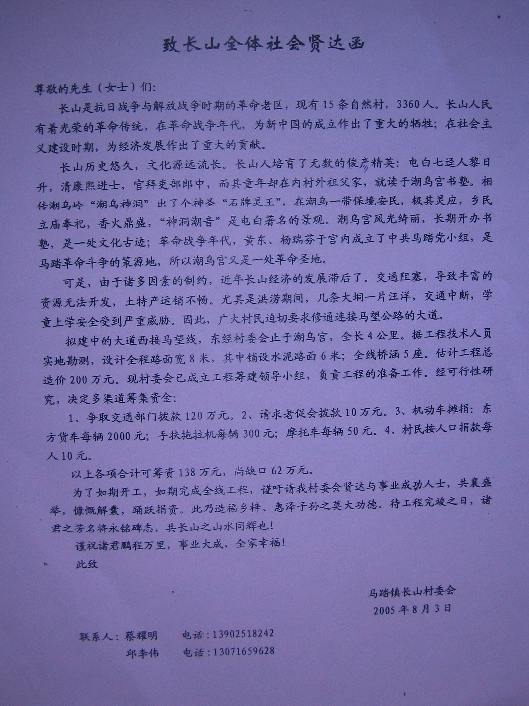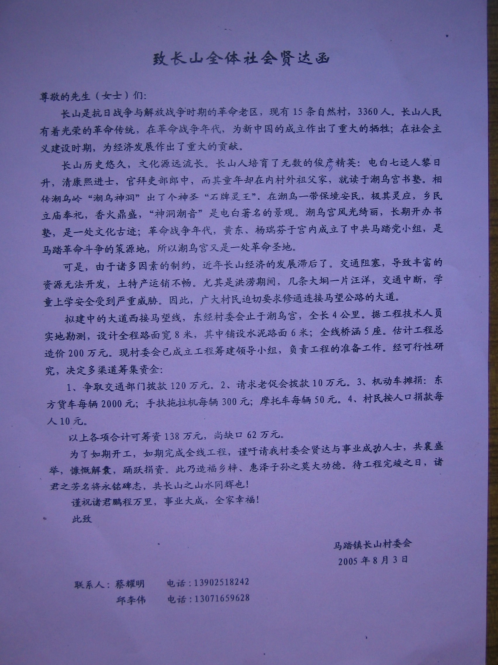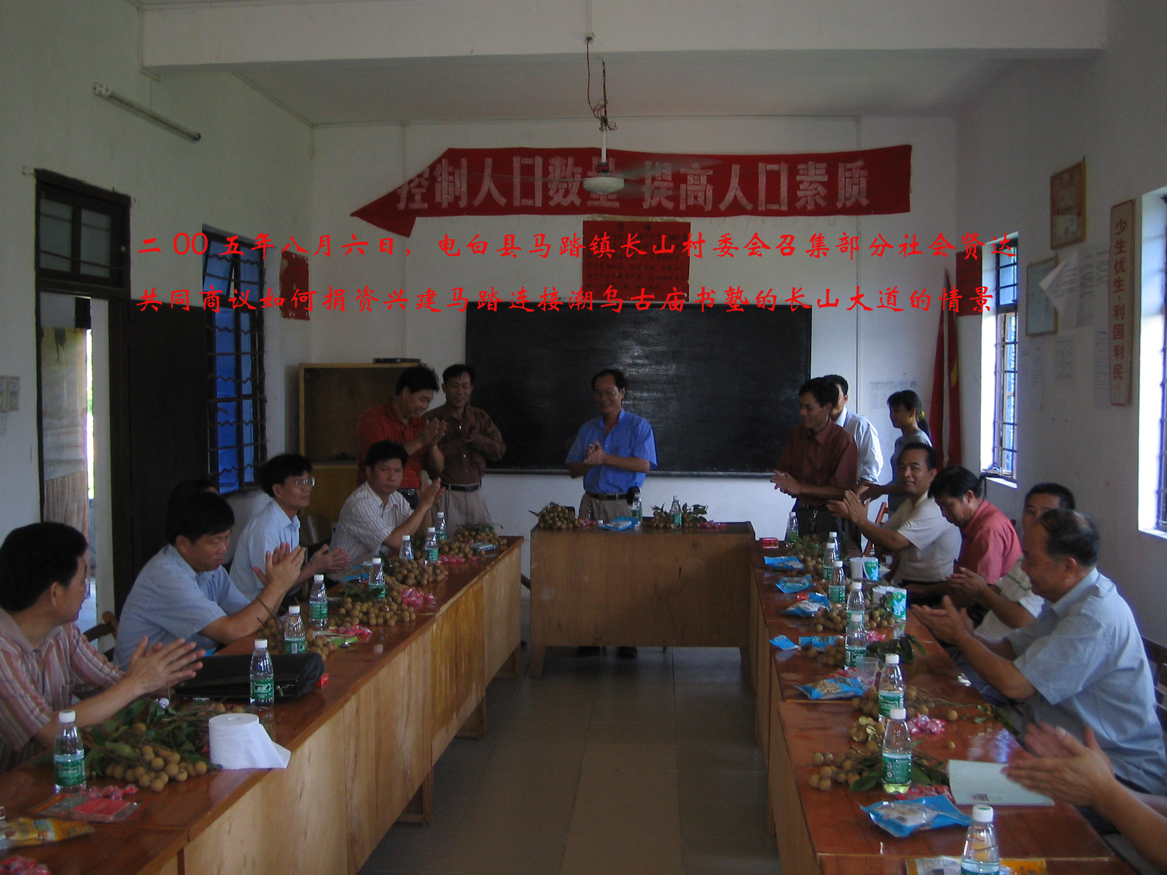 2005年8月6日,长山村委会召开部分乡贤座谈会,讨论捐资兴建长山大道.
