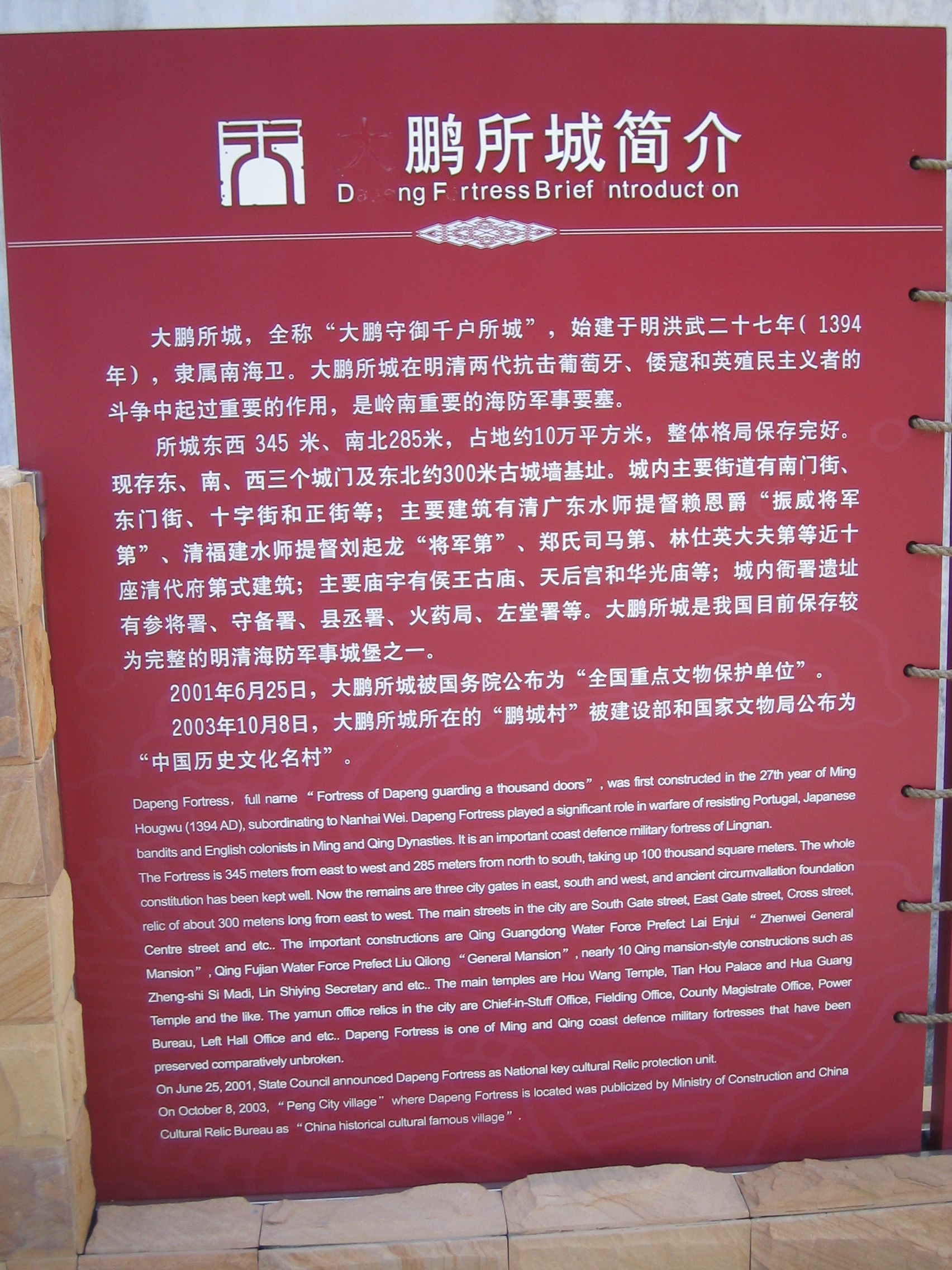 深圳:大鹏古城位于深圳市东部大鹏镇鹏城村,占地11万平方米,始建于公元1394年,