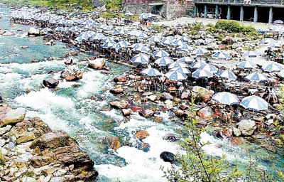 6月24日,在成都红口漂流区内摆放着数十里的遮阳伞和麻将桌。周末,市民便纷纷驱车来到这里,脱了鞋,挽起裤脚,把脚泡在冰凉的河水里,围坐在水中的麻将桌旁打牌喝茶休闲避暑,很是惬意。
