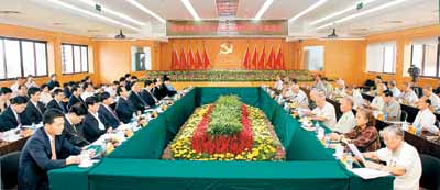6月30日,庆祝中国××党成立85周年暨总结保持××党员先进性教育活动大会在北京中南海怀仁堂隆重举行。胡锦涛、吴邦国、温家宝、贾庆林、曾庆红、黄菊、吴官正、李长春、罗干出席大会。 新华社记者樊如钧摄