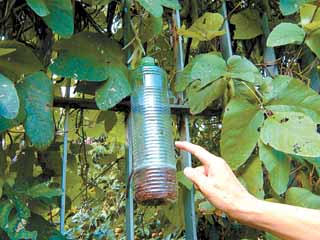 汪老师的一位老朋友得知此事后,从香港带来了一瓶农药,据说这药可以诱捕此类飞蝇。今年5月,几位老人按照说明书的要求,将水、药和油的混合物放入侧身有洞的大瓶子里,然后把瓶子挂在果树上。这下,总算抓到了“罪魁祸首”。好多苍蝇模样的虫子飞进了瓶子里,老人粗略估算了一下,至今为止大约抓到了近千只虫子。