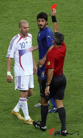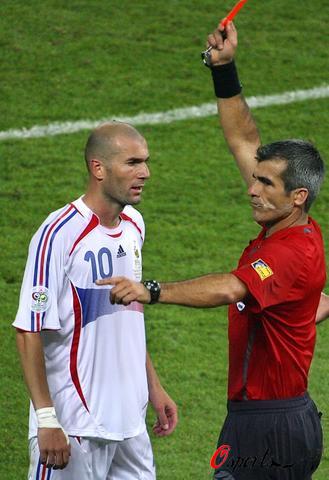 齐达内在无球的状况下用头撞倒了马特拉齐,被红牌罚下!!!