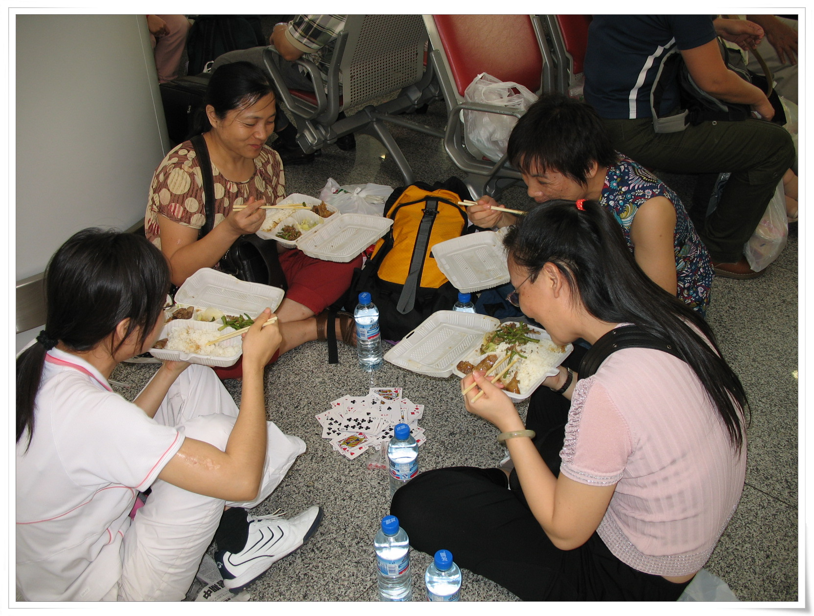 可惜飞机要晚点2小时,从6点推迟到8点登机,航空公司提供价值3元的免费晚餐给可怜的、无奈的队友: