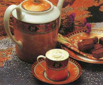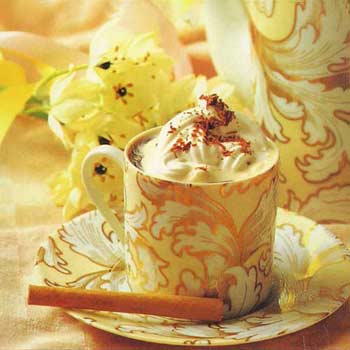 配制方法:将深煎炒的咖啡、溶化的巧克力、可可、蛋黄和少量牛奶在火上加热,充分搅拌,加入1小匙砂糖,搅拌均匀后,倒入杯中,加1大匙奶油浮在上面,削上一些巧克力末作装饰。