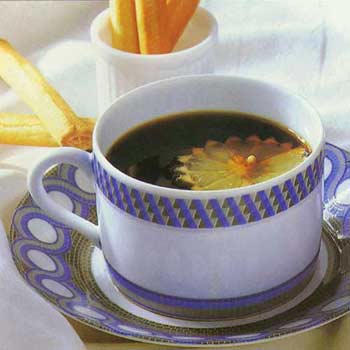 配制方法:在杯中倒入浅煎炒的咖啡,再滴上2~3滴烧酒,最后将切成薄片的柠檬浮在上面。