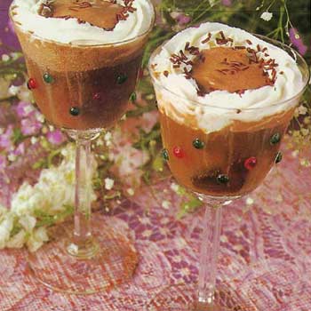 配制方法:在杯中依次加入20克巧克力、深煎炒的咖啡、1小匙白薄荷,再加1大匙奶油浮在上面,削上一些巧克力末,最后装饰一片薄荷叶即成。