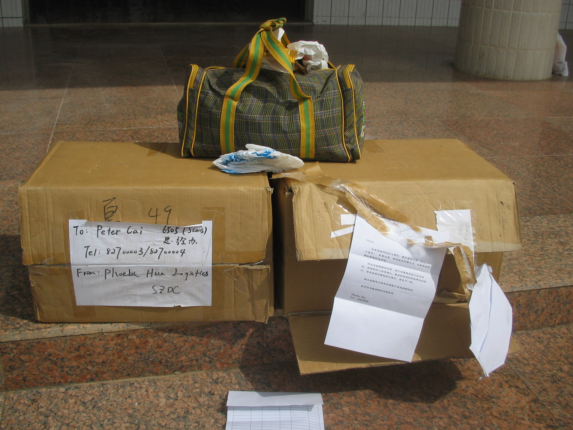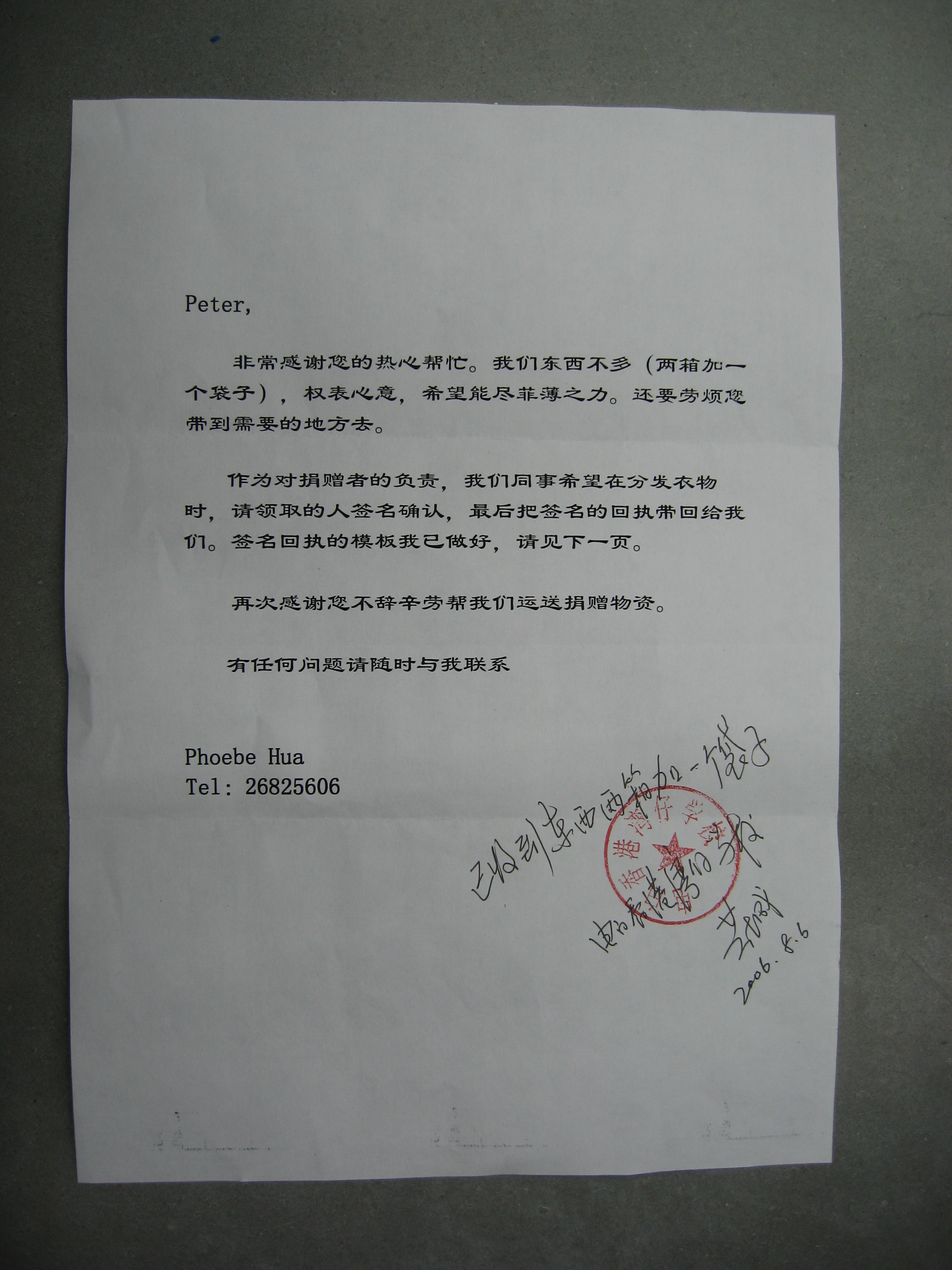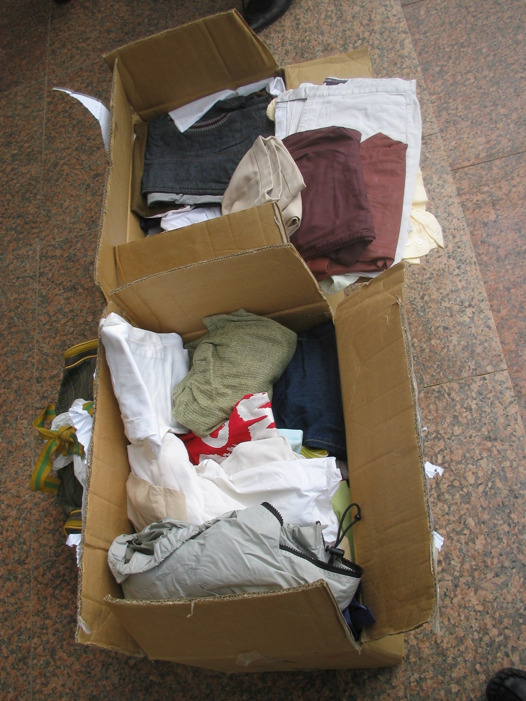 本来这些衣服是给深圳民政局的.后来我把他们说服,告诉他们我们县有一个孤儿学校需要帮忙.他们就把衣服转交我.