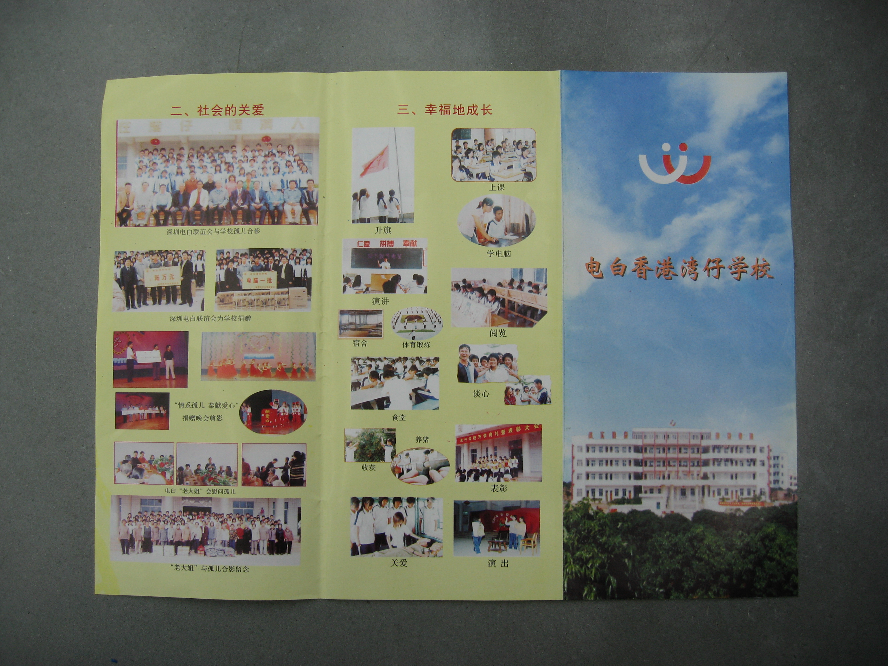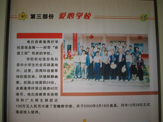电白香港湾仔学校是一所“爱心学校”,由香港湾仔各界社会贤达(大部分为电白籍人)捐资40万港币、电白县教育部门领导和广大师生捐款近100万元人民币合力建成,于2003年开始招收孤儿学生。这些孤儿在校的学习及生活费用全部由教育部门设立的“扶孤助学”基金及社会热心人士捐助解决。目前,该校有3个教学班108人,学生全部为没爹没妈、无依无靠的孤儿。