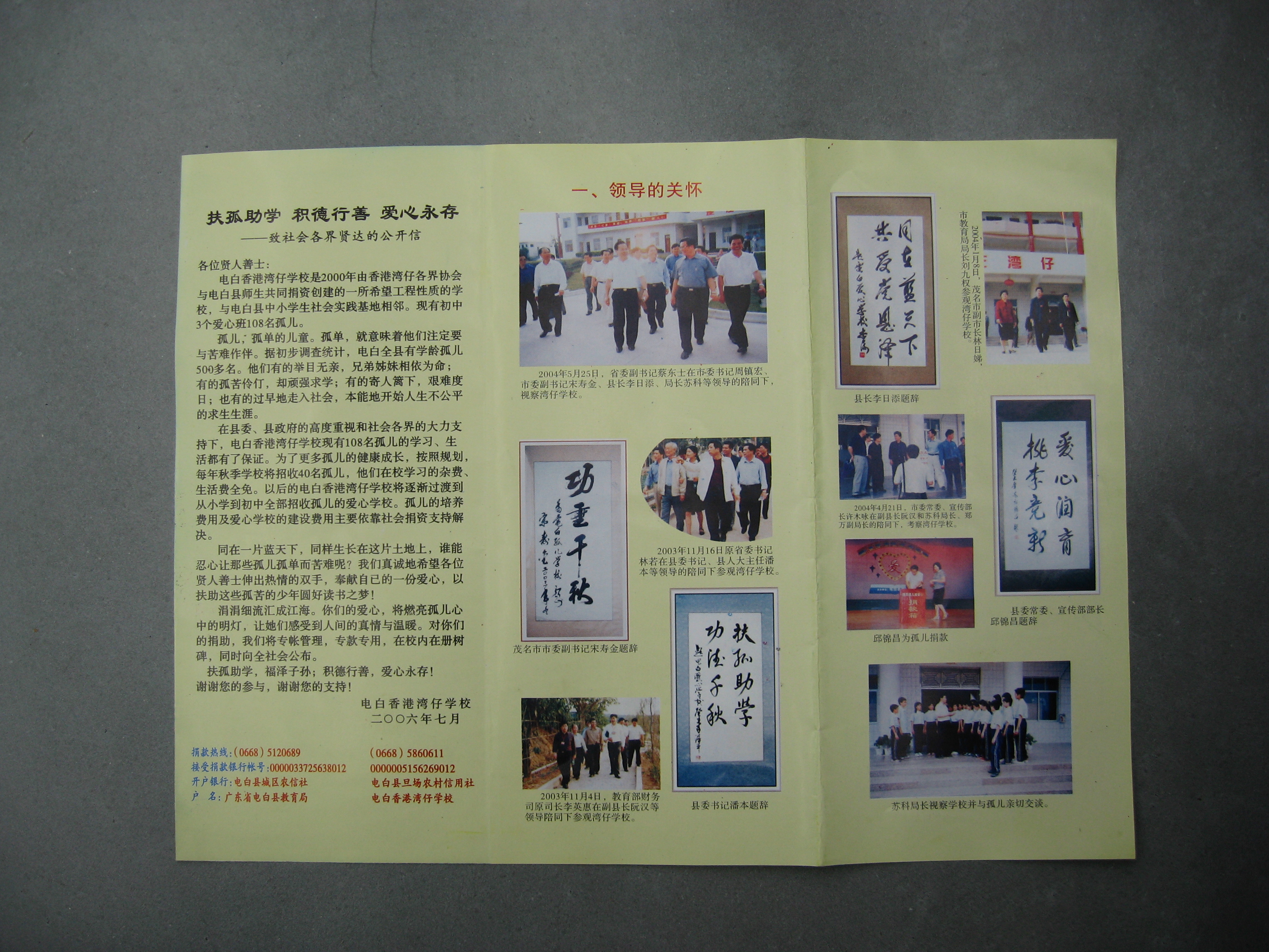 该校自创立以来,得到社会各界热心人士的鼎力支持和热心帮助。深圳市龙岗区企业家联合会、深圳电白乡亲联谊会会长廖寿伦先生就是其中一位。今年3月,廖先生曾两次带领深圳电白乡亲联谊会的企业家到该校慰问孤儿,共向孤儿捐赠了6万元钱和4台电脑、1套音响。父亲节前夕,廖先生惦记着这群无父无母的孤儿,再次带领深圳龙岗区企业家联合会、关心下一代工作委员会的人员及该区热心人士一行20多人(大部分为做了父亲母亲的人士),专程来到湾仔学校,亲切看望孤儿。当日,“深圳爸妈”们与孤儿围坐在一起,亲热得就像一家人。在详细了解了孤儿们在校的学习与生活情况后,在廖寿伦先生的倡议和带头下,进行了现场捐款,共捐集爱心款29000元,并当场将这笔款捐赠给了学校,用于孤儿的学习与生活。捐赠仪式上,廖先生表示,今后还将介绍更多的深圳企业和企业家到学校认养孤儿;对学习成绩优秀、考上县重点高中的孤儿,将资助其读高中,甚至大学;对初中毕业想就业的孤儿,将积极联系深圳企业,安排其就业,解决孤儿的生活出路问题。(记者 梁爽 通讯员 张宁)