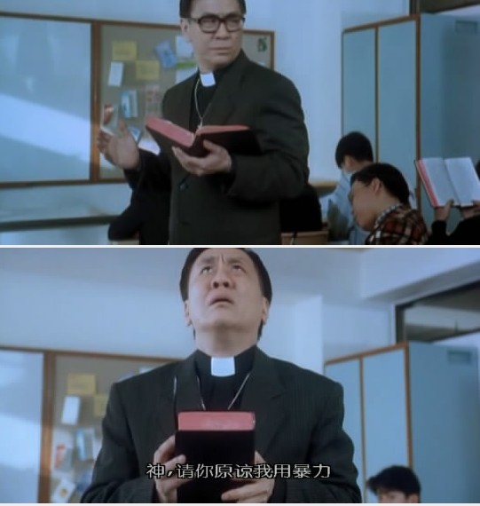 《逃学威龙2》中饰演大过校长的王牧师,在课堂上打了一下周星驰,然后念念有词:“神,请你原谅我使用暴力。”结果,砰~~被周星驰一拳打倒了。