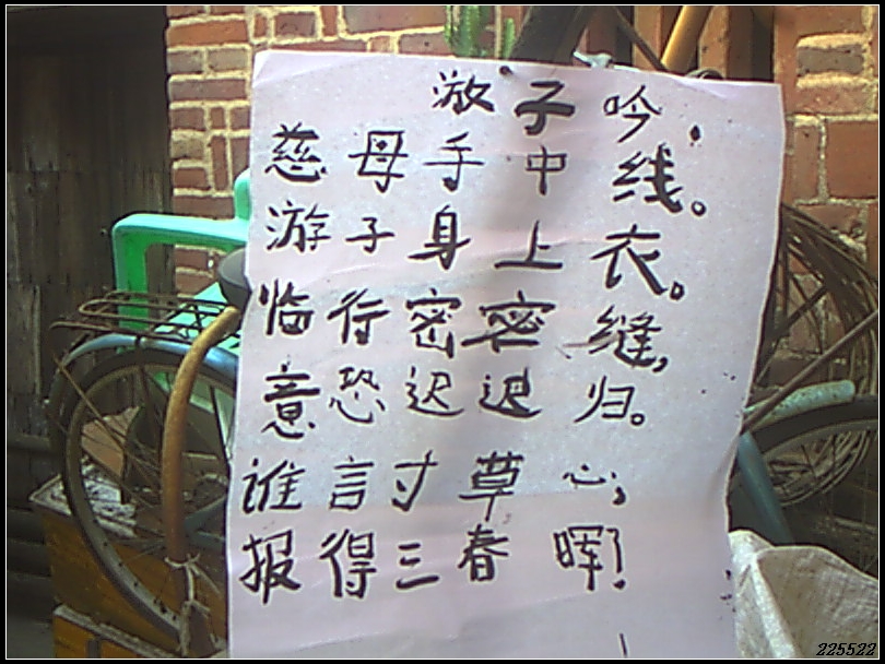 QUOTE(552255 @ 2009年05月09日 Saturday, 06:59 PM) 慈母手中线,游子身上衣。临行密密缝,意恐迟迟归。谁言寸草心,报得三春晖。 [snapback]2760122[/snapback]