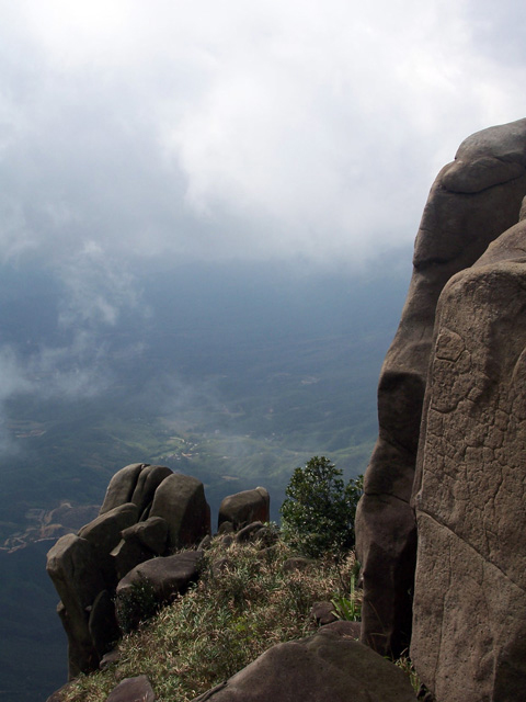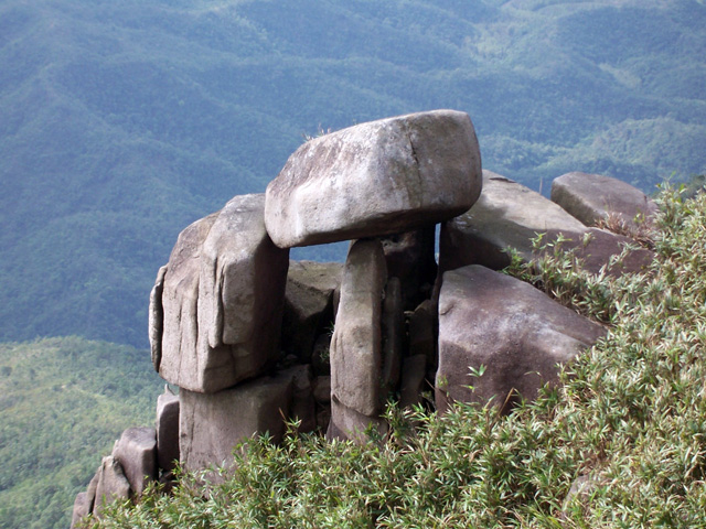 我们站在通往峰顶的长长的石级上,将鹅凰嶂的美景尽收眼底。远处,云雾飘渺,在雾缝间,现出一片美景来,仿如风儿撩起少女裙袂,露出一只玉腿,那是一片起伏连绵的低矮的山丘,如织似绵,如波似浪,黄绿黄绿的,煞是好看,在天空的尽头,隐约可见一水如镜,静静地躺在山间。近处,是鳞旬怪石,有如将军远眺,有如鼠爬状,有如猴头像,也有如母女相吻,形态各异,也有巨石危立于悬崖边摇摇欲坠,仿佛游人一声呼叫也可将其震落万丈深渊。我急忙抓起我的国产老爷机子,不停地按动快门,以期将此人间仙景长存,虽然我知道拍出的可能是一片模糊。