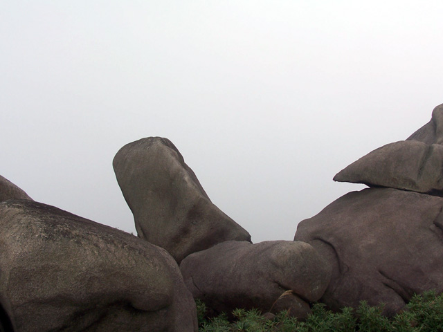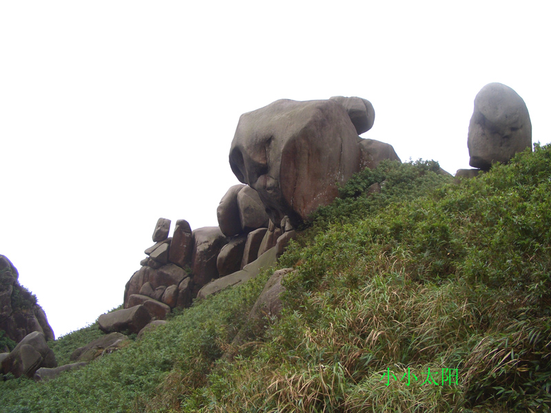 穿过山洞,登上峰顶,这里是防空洞顶部,水泥浆浇灌,使峰顶没有了天然本色,这是人类争斗的产物,这是历史的悲哀,这是人类的悲哀,这悲哀将远无尽头,噬食着世世代代老伯姓善良的心。此时,大雾重新积聚过来,将在峰顶休息的人们挤逼。阿翔独自坐在峰岩边上沉思,小小太阳在寻找理想的拍摄角度,飞龙小侠在摆弄心爱的DV机,一小驴在翻看随身携带的书本,一驴打开地席在躺睡,也有一圈烟民在吞云吐雾,享受登顶带来的快意,众多的驴们一边在腐败着带来的食物,一边在笑谈此行的收获。而我在驴们身边团团转,捕捉特别镜头。一派休闲景象。