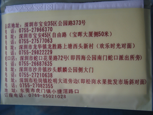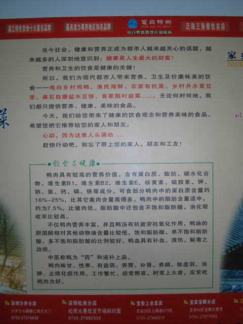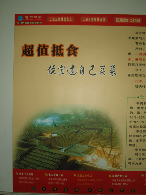 QUOTE(四中乐叔 @ 2006年12月31日 Sunday, 05:14 PM) 元旦活动召集。 2007年1月1日中午,龙华的电白鸭粥店AA聚会,费用控制在20-30元每人(拉部分赞助补贴)。 计划: 1日上午,由在蛇口的老乡去海鲜批发市场购买海鲜,中午12点到龙华的电白鸭粥店加工,可以加工蚝炸、雨炸、干煎、盐水杂鱼煲的,中午和下午在电白鸭粥店的二楼大厅开展各种游戏活动,打牌、唱歌、杀人游戏等等。 同时也邀请部分联谊会的领导参加。 电白鸭粥店地点:在龙华的上塘布龙公路边的乡村酒吧附近,旭联啤酒城附近、广西工业区附近、南岗鱼村附近、上塘派出所附近。 [/SIZE] 酒楼电话:0755-29822229 [snapback]1606553[/snapback] 11点半从深圳出发。如不堵车,12点应该到。先到请先等。