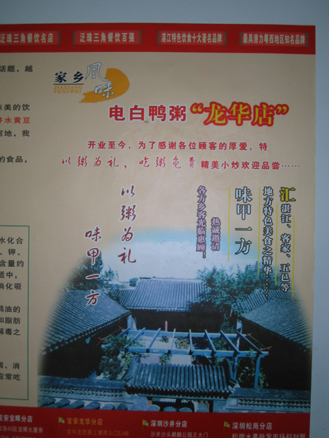 元旦活动召集。 2007年1月1日中午,龙华的电白鸭粥店AA聚会,费用控制在20-30元每人(拉部分赞助补贴)。 计划: 1日上午,由在蛇口的老乡去海鲜批发市场购买海鲜,中午12点到龙华的电白鸭粥店加工,可以加工蚝炸、雨炸、干煎、盐水杂鱼煲的,中午和下午在电白鸭粥店的二楼大厅开展各种游戏活动,打牌、唱歌、杀人游戏等等。 同时也邀请部分联谊会的领导参加。 电白鸭粥店地点:在龙华的上塘布龙公路边的乡村酒吧附近,旭联啤酒城附近、广西工业区附近、南岗鱼村附近、上塘派出所附近。 [/SIZE] 酒楼电话:0755-29822229