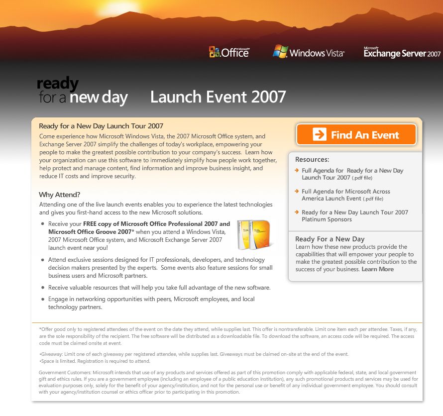 微软官方网站刚刚宣布展开一项“New Day Launch Tour 2007”活动,所有及时参与Windows Vista、Office 2007发布会的申请用户都可以获得免费的Office Professional 2007以及Office Groove 2007拷贝。