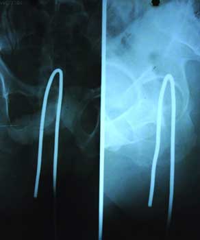 X光显示,插入受伤男子肛门的铁钩,已经深入腹腔,由于腹腔内的铁钩有一个回弯并已经深入到腹腔内的软组织里,所以用外力拔出将非常困难。