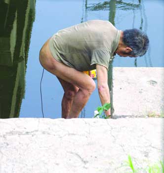 他光着的双脚也必须呈八字型交替着慢慢挪动。在从他运河桥下的“家”到河沿边,不到10米的距离间,他花费了至少5分钟。
