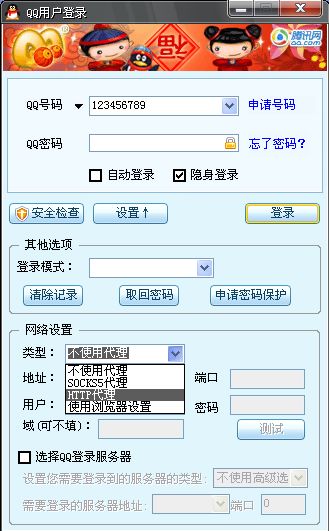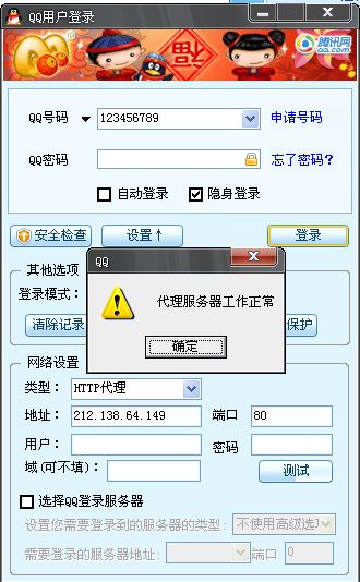 设置代理上网. 打开QQ登陆窗口----设置---网络设置---类型(HTTP代理)---输入代理IP后点---测试---登陆 会有提示,如果成功就可以登陆,不成功就找另外一个代理的IP. IP代理网址:http://www.ipbbs.com 要找端口是80的哦. [attachmentid=121834] [attachmentid=121835]