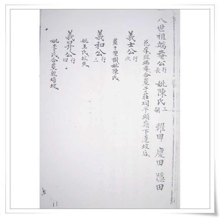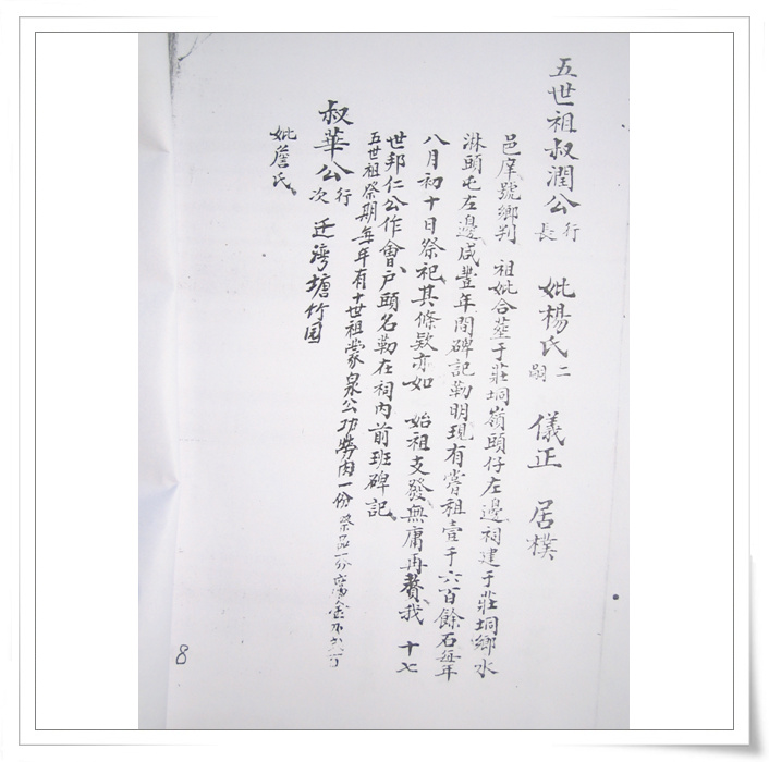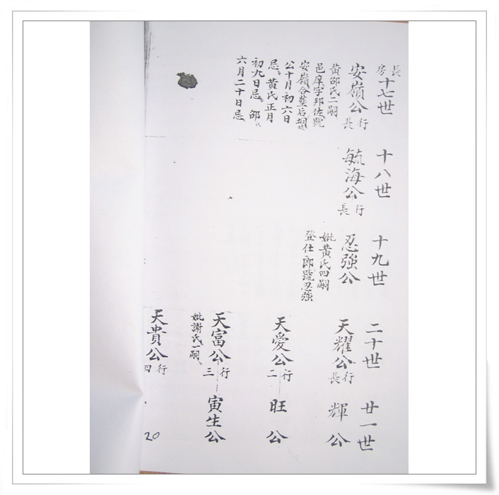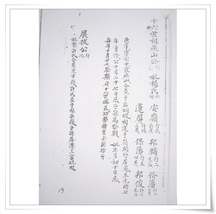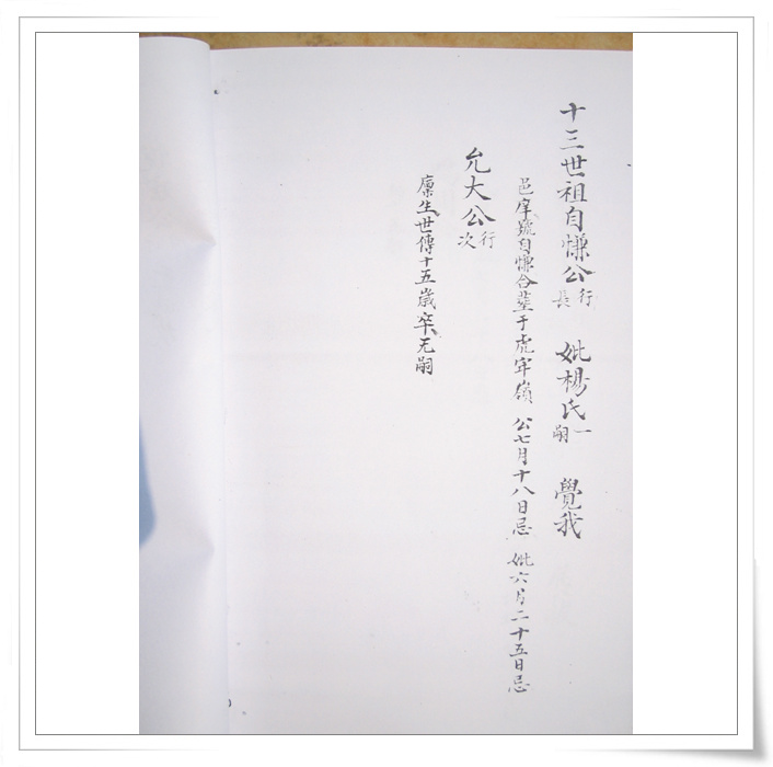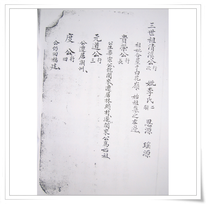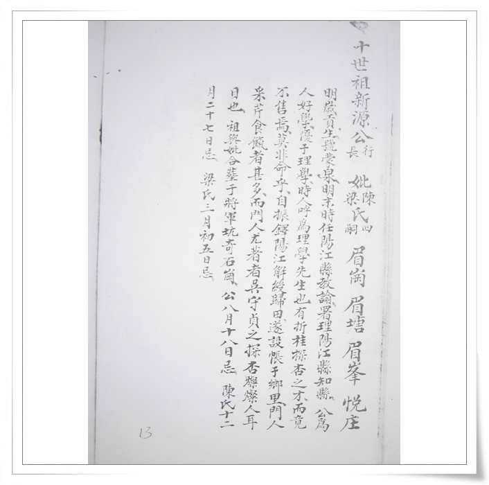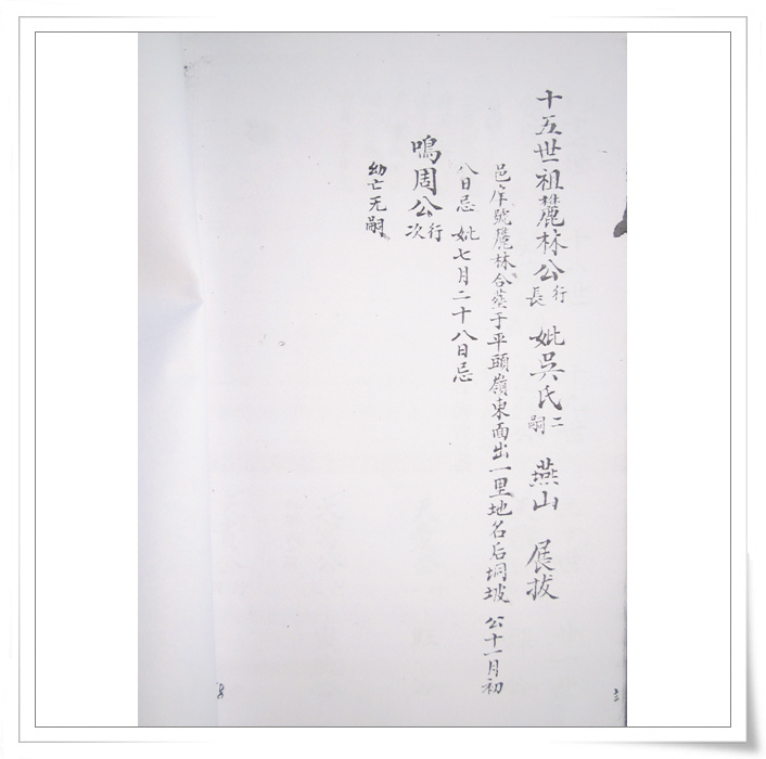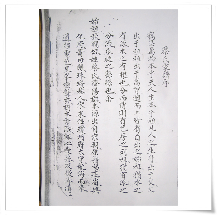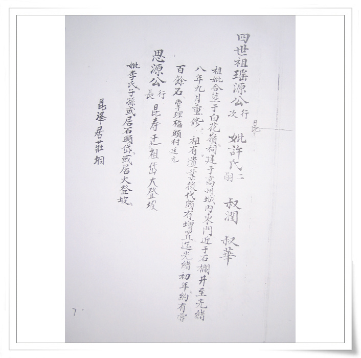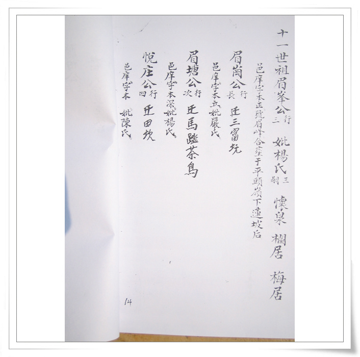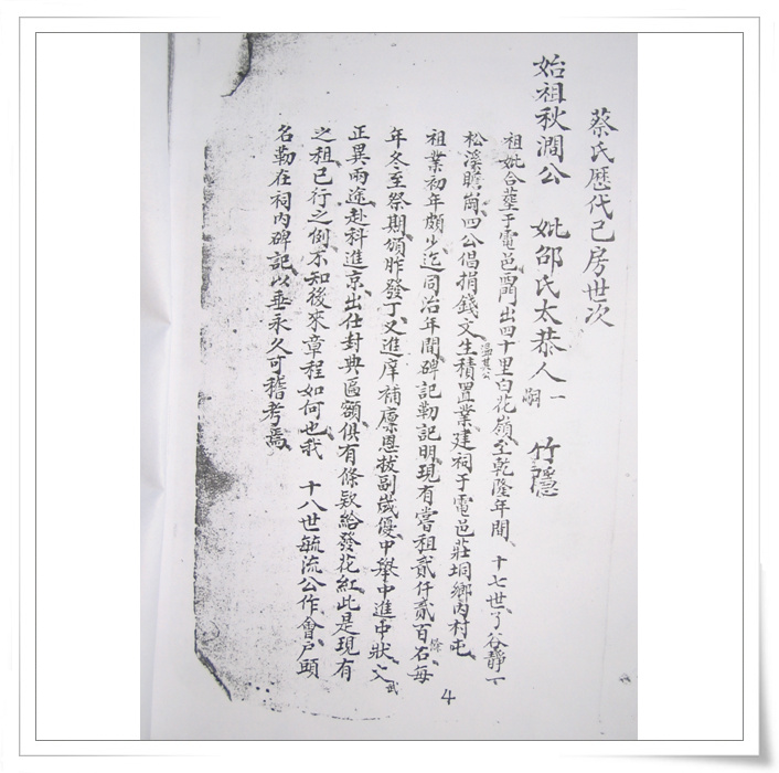 四中乐叔 版主 版主 注册 2006-05-06 消息 6,725 反馈评分 3 点数 61 2007-04-15 #74 QUOTE(四中乐叔 @ 2007年02月28日 Wednesday, 12:04 AM) 广东省电白县 蔡氏家谱 族谱 蔡族历代祖妣名序列下 始祖秋涧公妣邵氏太恭人生二子 长子度公回莆田 次子竹隐公居P垌(广东省电白县电城镇P垌乡) 祖曾任州太守,福建省兴化府莆田县珠玑巷人。离任归里路过P垌时,见此地风土人情甚佳,举家自宋末帝m(约公元一二七八年)时,由原籍迁居P垌,即电城东十里之P垌乡,并带祖父济阳公塑像,将之供祀于村边新建济阳公祠,今境主庙前戏台后,而起旧址也,俗称“妆春宫”以后代虔诚之心,后代子孙繁衍,人口增多便成为蔡屋村。清道光年间,秋涧子孙定阴历元月十五日为济阳公祭祀日,每隔一年元月十四、十五、十六日为“年例期”,搭演戏,举行“妆春”扮演话剧等民间活动,俗称扮“佛地”以表鞭鞑,迎接福祥。 来时带有压船石版一块、石臼一只,现有存在。石版在庙前、石臼在山觅太夫人庙边。回想自宋至今数百年之久,传有卅余代,其后裔之盛,族旺之隆,冠于全邑,非祖德之远庇,安能若是乎,天之功报厚德者,理有或爽哉。 祖享寿七十九岁,于元十八年二月十七忌日。 妣享寿七十二岁,于元十二年三月十六忌日。 大宗祠建P垌内村屯,坐西向东。入伙对联:长发其祥,暖(?)得我所。大宗祠门联:济阳欣庆,f垌分基。蔡族济阳郡。 祖妣合葬白花岭大垌村后坐甲向寅。 二世祖竹隐公妣吴氏太孺人生四子。 长子荣贵公迁林头(电白县林头乡)为始祖,次子居P垌,三子道公迁迁潮州,四子度公回莆田 边地头 [snapback]1684989[/snapback] 附件 IMG_0078.jpg 105.3 KB · 查看: 834 IMG_0079.jpg 159.7 KB · 查看: 838 IMG_0080.jpg 123.1 KB · 查看: 881 IMG_0081.jpg 160.4 KB · 查看: 927 IMG_0082.jpg 116.6 KB · 查看: 913 IMG_0083.jpg 121.2 KB · 查看: 924 IMG_0084.jpg 108.9 KB · 查看: 820 IMG_0085.jpg 125.8 KB · 查看: 874 IMG_0086.jpg 118.2 KB · 查看: 849 IMG_0087.jpg 121.4 KB · 查看: 842 IMG_0088.jpg 108.4 KB · 查看: 828 IMG_0089.jpg 118.7 KB · 查看: 877 IMG_0090.jpg 121 KB · 查看: 943 IMG_0091.jpg 109.2 KB · 查看: 849 IMG_0092.jpg 103.6 KB · 查看: 855 IMG_0093.jpg 93.8 KB · 查看: 839 IMG_0094.jpg 88.6 KB · 查看: 815 IMG_0095.jpg 94 KB · 查看: 737 IMG_0096.jpg 124.4 KB · 查看: 834 IMG_0097.jpg 110 KB · 查看: 777