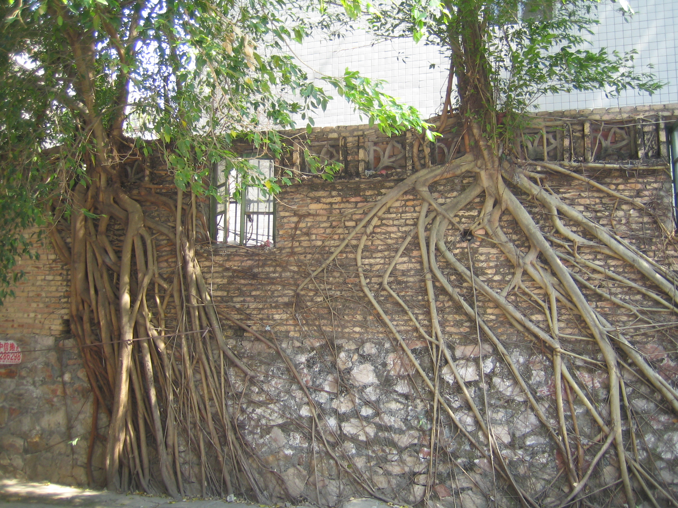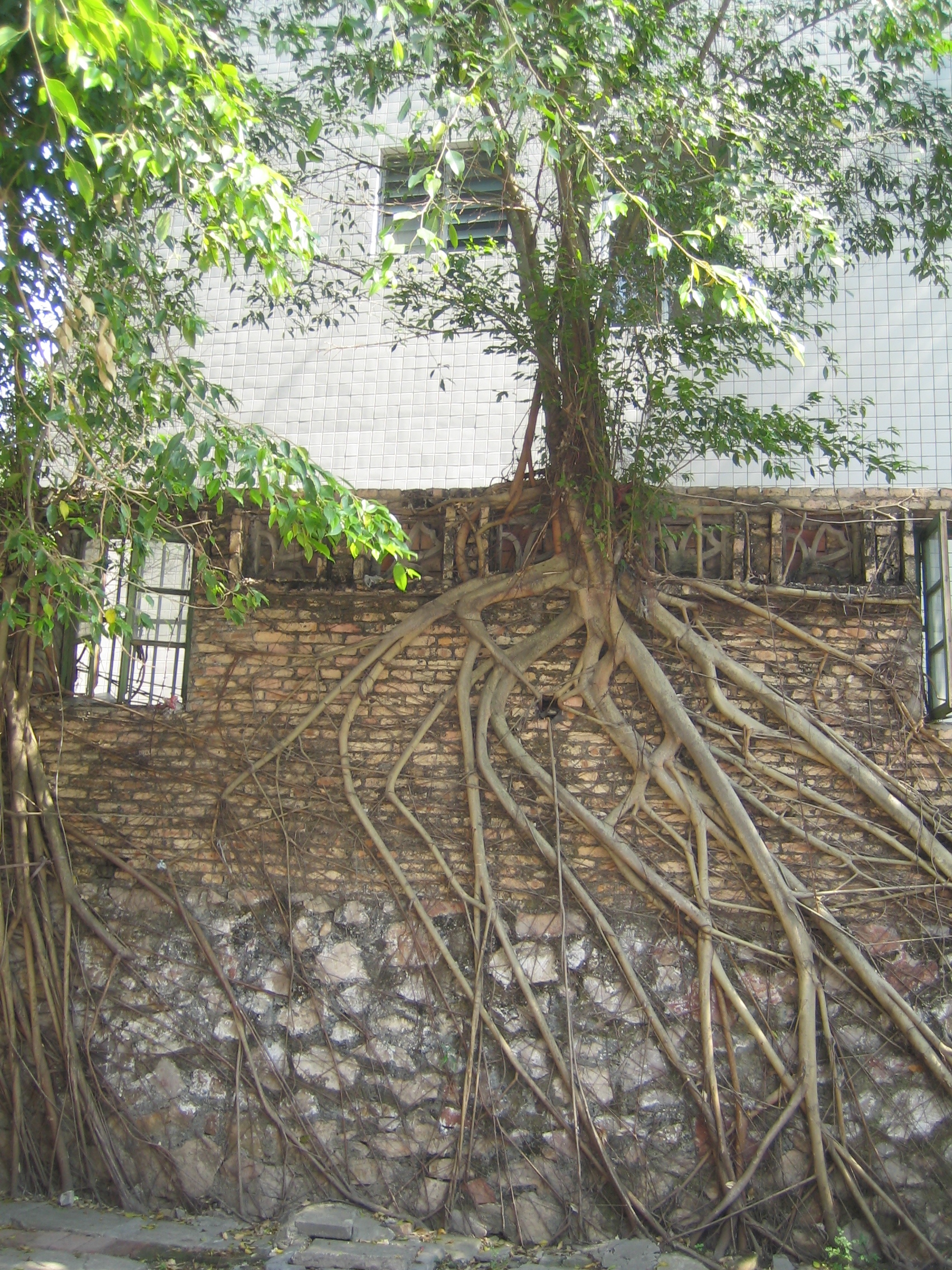 今天去新厝仔做年例才看到一颗大榕树,那棵事的周边是用水泥围起来的,所以不长垂下来的根,当时我就在想,这种事是不是有"感觉"的,要不它怎么知道下面有水泥地而不长根呢.因为在我见过的其它长在没水泥地的大榕树基本上有很多垂根.