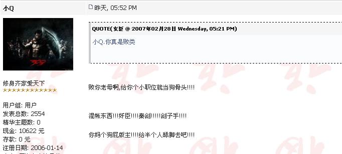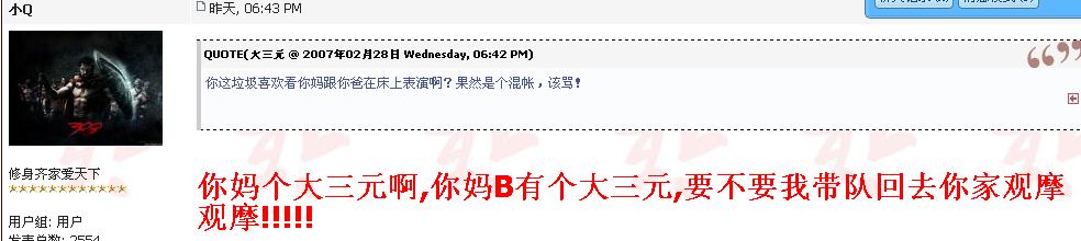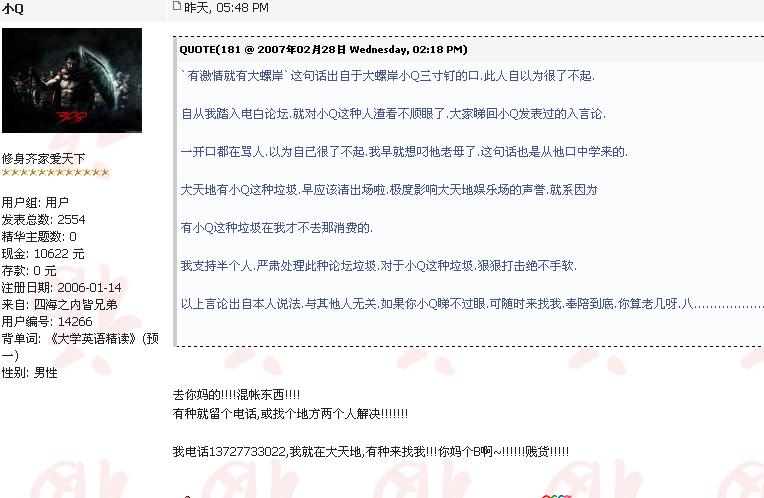 大天地算什么东西,干吗一定要说我是那里的员工,什么毒素我也不认识是什么人物,我来这里是专门扫除小Q这些垃圾的,说话说得那里好听,做事象疯狗一样,垃圾不如。