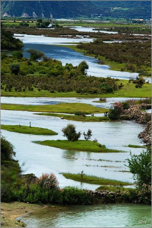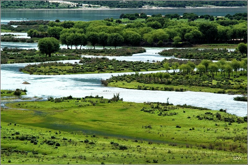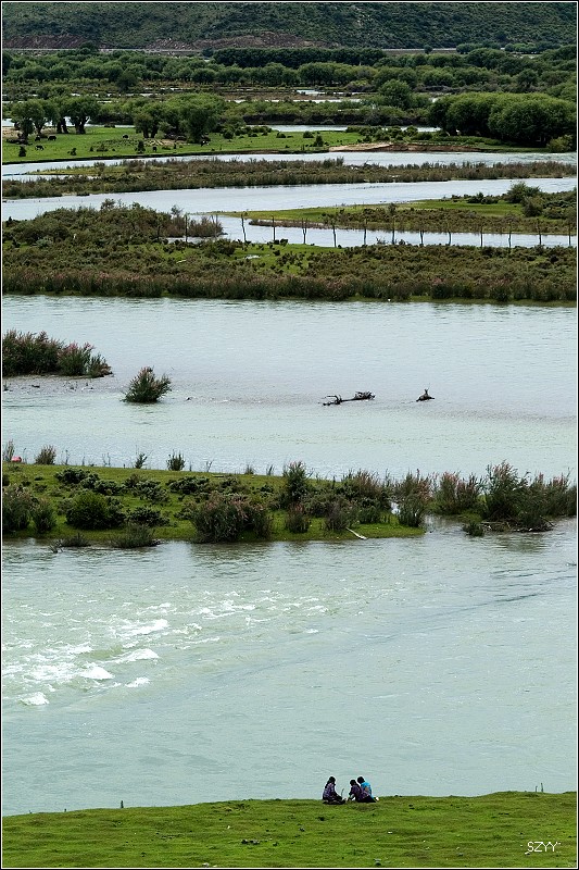 我们拍照的时候,周围有一些藏族小孩子要东西,我们一路上已经把车上的书本文具分发完了,还有一袋文具图书放在老曲的车尾箱里,老曲已经单车先走了。也许是因为这个景区来的游客比较多,跟此前我们遇到的孩子们相比,这些小孩已经不那么淳朴了,在我们的车上到处找东西,甚至拉开我们车的后尾箱,很无奈。继续前行,到达尼洋河和雅鲁藏布江的交汇处,尼洋河的清水和雅鲁藏布江的浑水相交,水线很明显。前面已经不好走了,坐船去雅鲁藏布大峡谷每人要500元,来回几小时,已经比较晚了,而且天气不好,不好拍片,另外我们的车放在这也不安全,所以还是不去看峡谷了,开车赶回林芝。