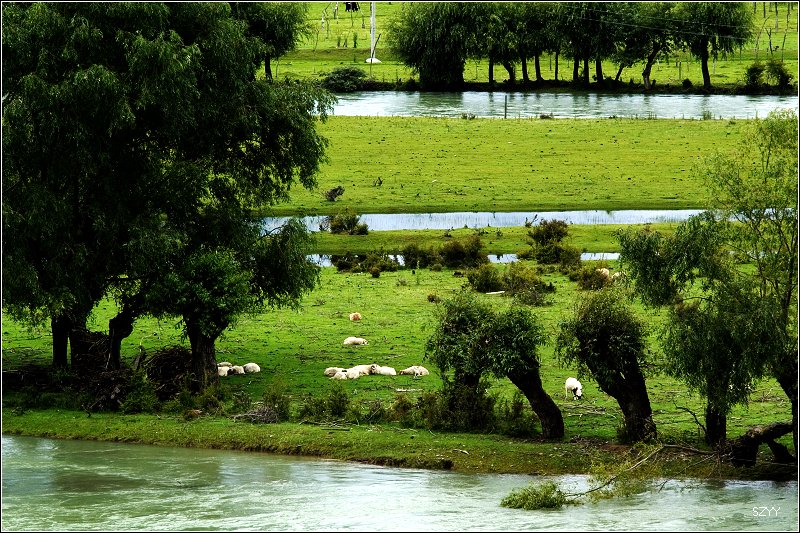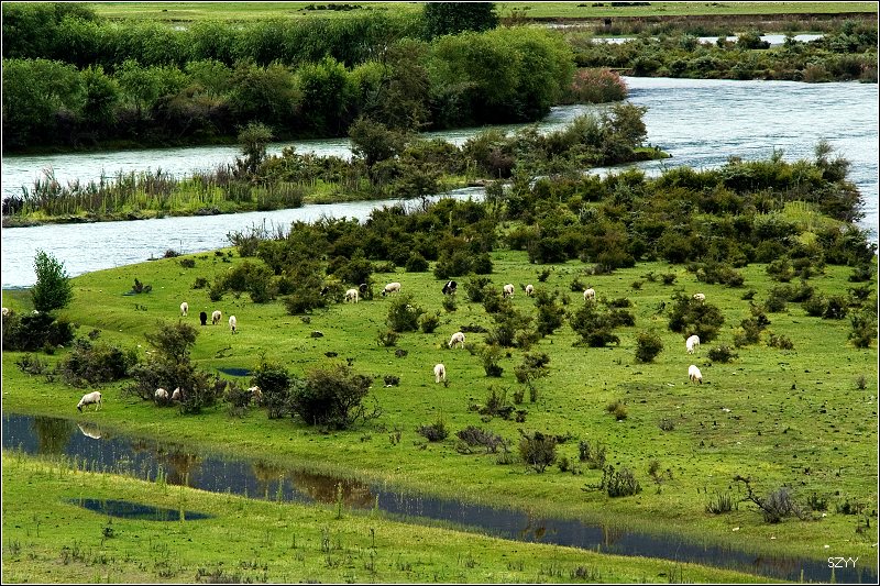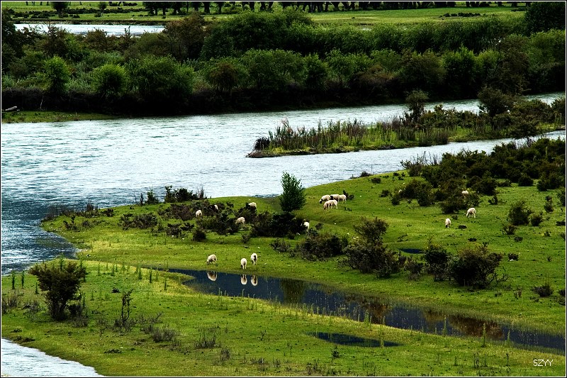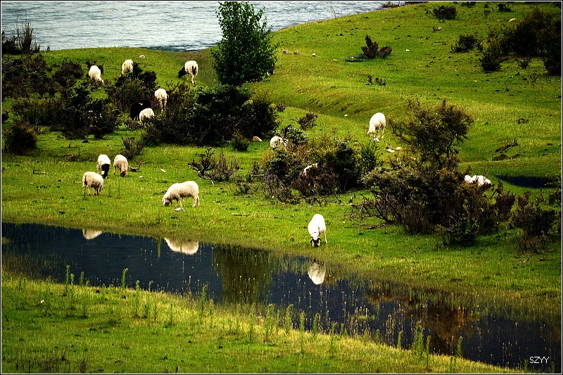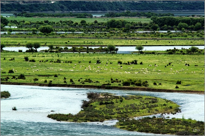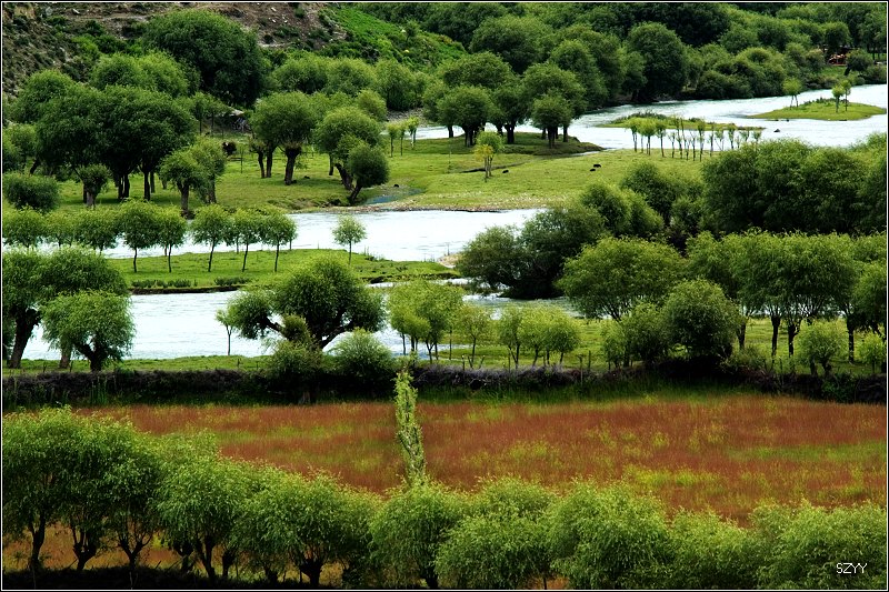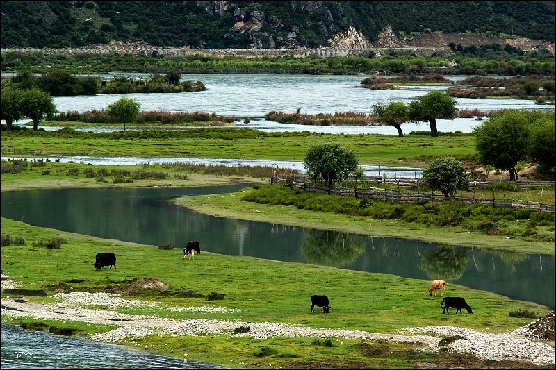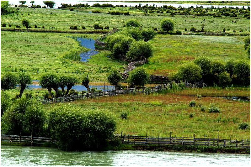 从世界柏树王园林出来,路边有卖水果的,我们买了些香瓜,沿路找到一个风景比较好的地方,停下来,边欣赏风景,边吃瓜。 垃圾我们可没有乱扔,我们一路上都在车里放着垃圾袋,垃圾全部入袋,并且,据说藏民视鱼为圣物(或者是说湖里的鱼),我们在进藏区之前就达成共识――进藏不吃鱼。所以在藏区,我们一直都没吃鱼。